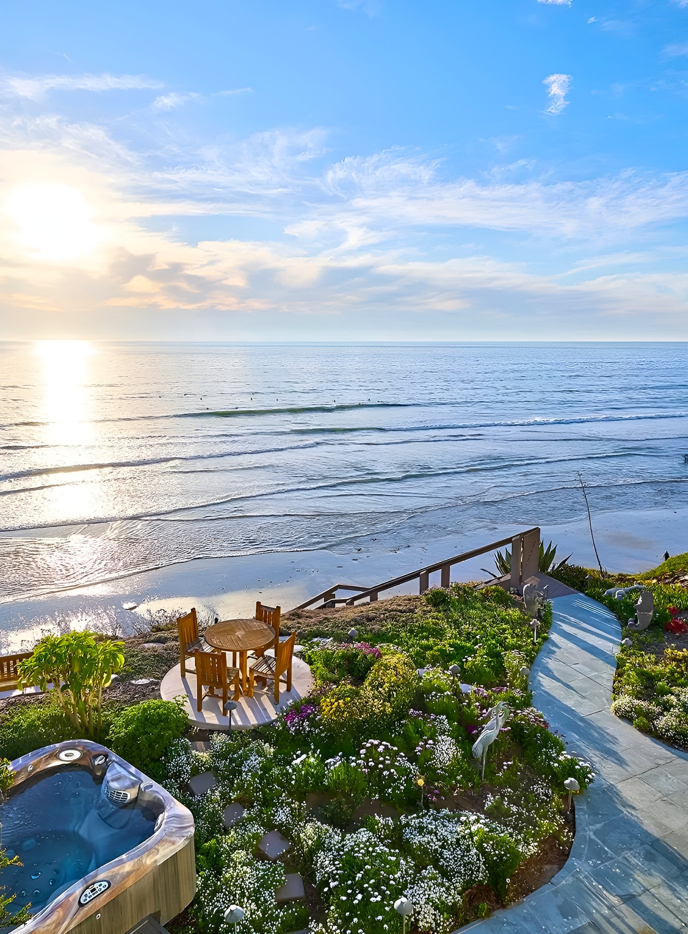This yard feels like a slow evening by the sea. The winding path leads your eye through flowers, ground cover, and a small dining spot before it reaches the beach stairs. The hot tub tucked to the side adds a resort feeling, but it does not steal attention from the water. That balance matters.