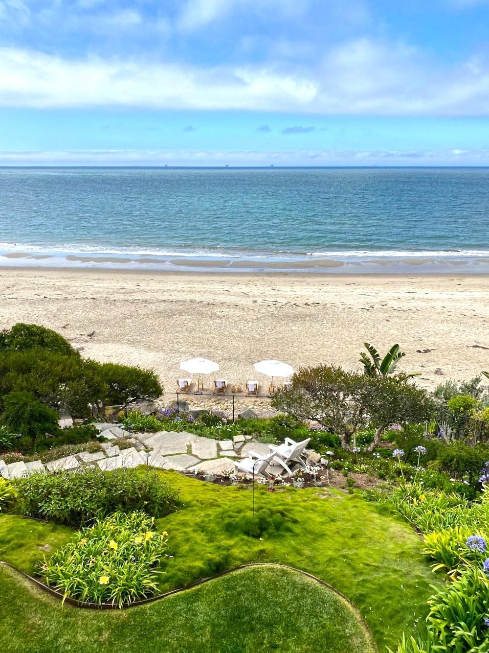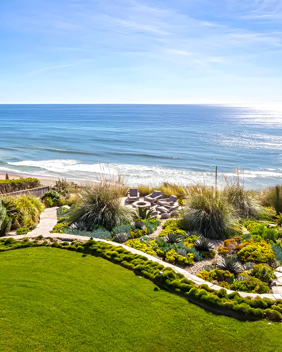 What works so well here is the shape of the plan. Nothing feels stiff. The curves echo the shoreline and soften the drop toward the beach. The planting is low enough to protect the ocean view, but full enough to make the space feel rich and private.