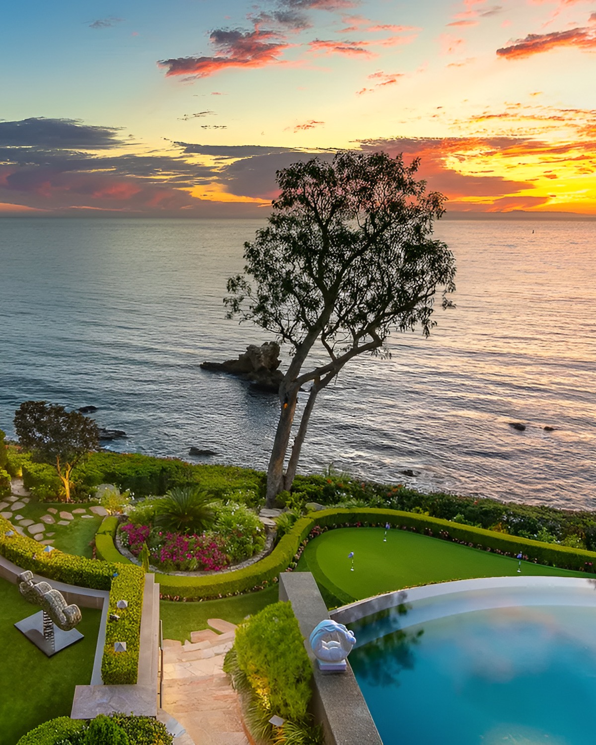 The beauty here comes from contrast. The water in the pool mirrors the ocean. The clipped greenery holds the design together. The stone adds age and substance. This is the kind of landscaping that makes every evening feel like an event.