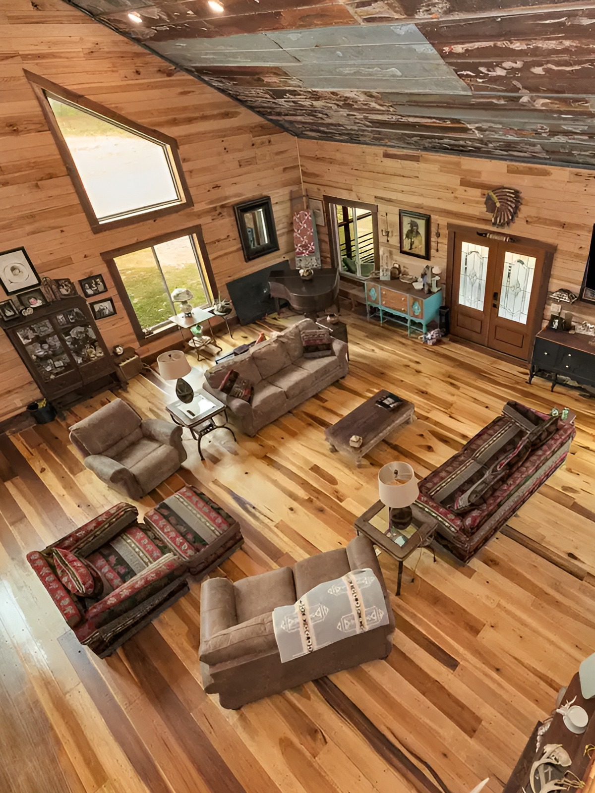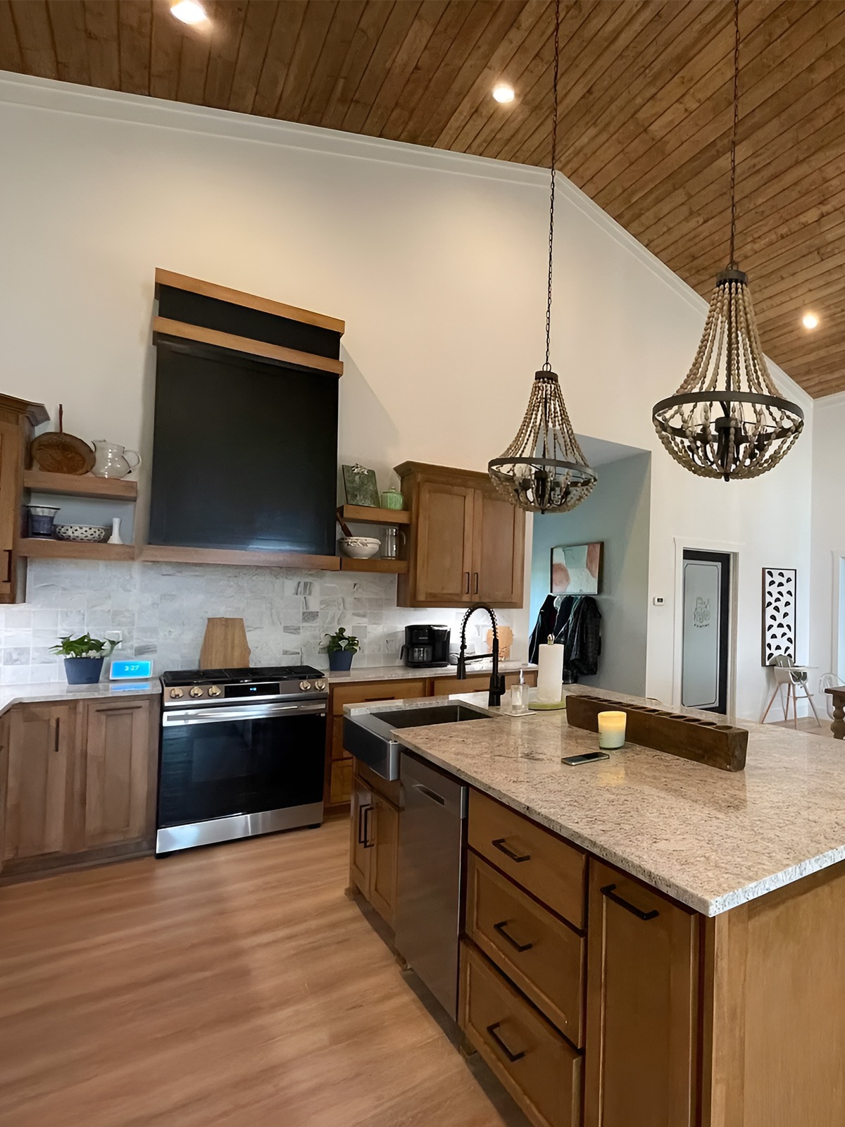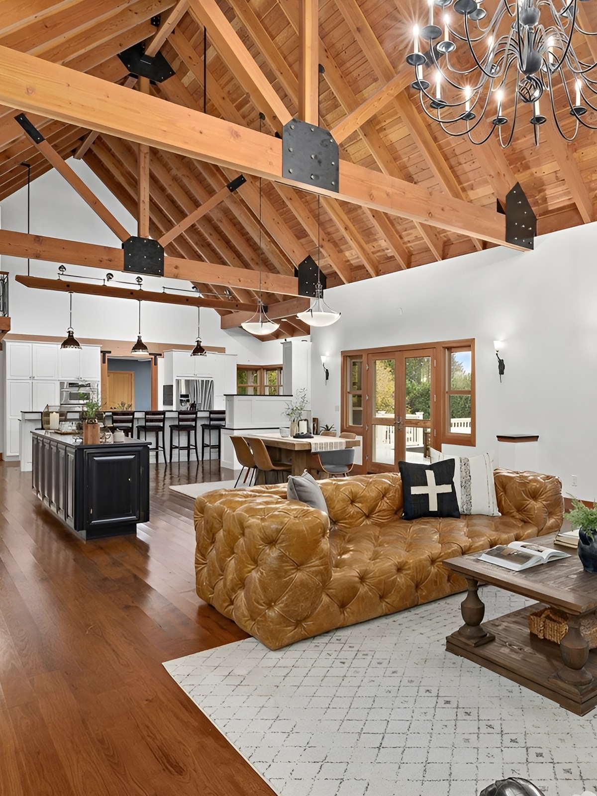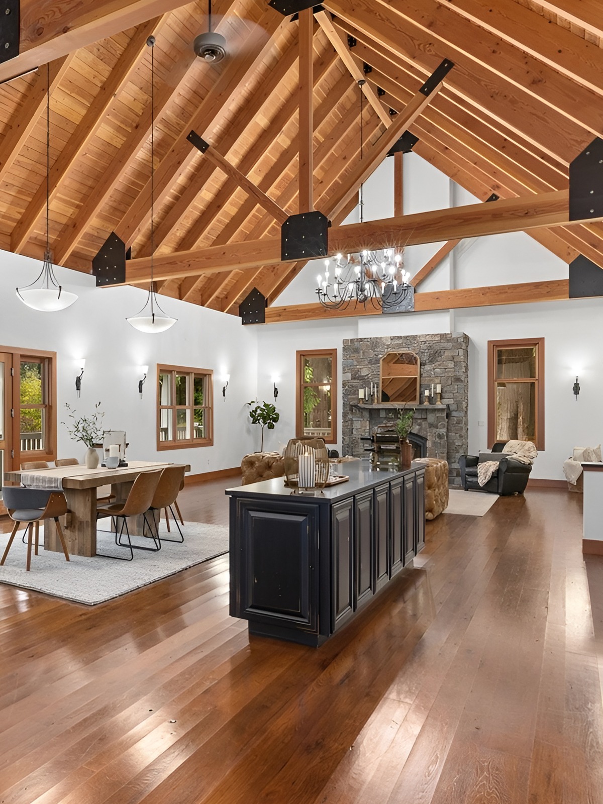 A single overhead fixture is not enough in large spaces. You need a mix of pendants, sconces, lamps, under-cabinet lights, and maybe accent lighting on beams or shelves. Warm light makes wood tones glow and keeps open rooms from feeling stark.