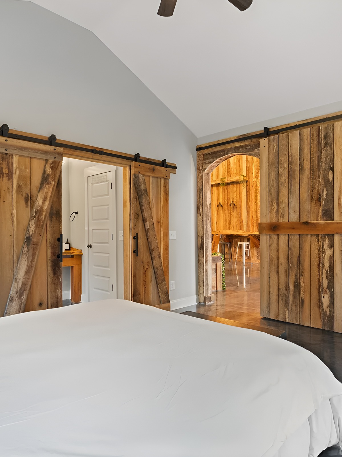 Use barn doors as accents, not everywhere. Choose hardware in black or aged metal. Match the wood tone to nearby beams, floors, or cabinetry so the look feels intentional.