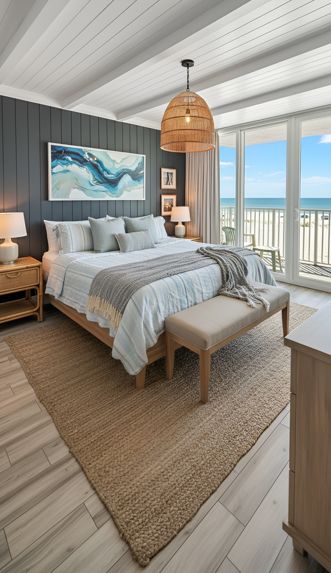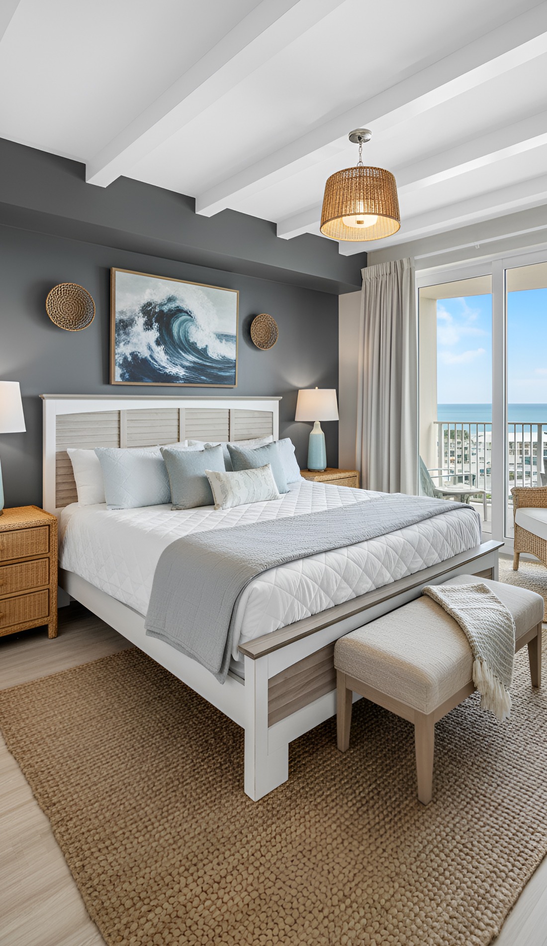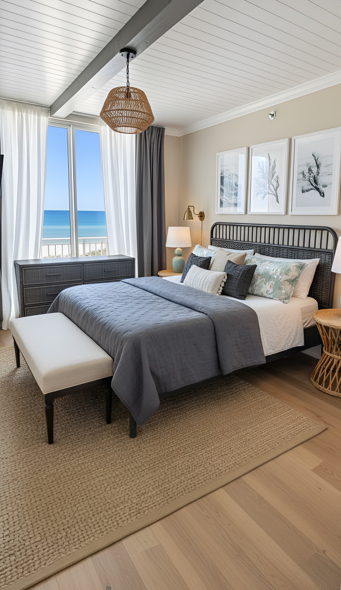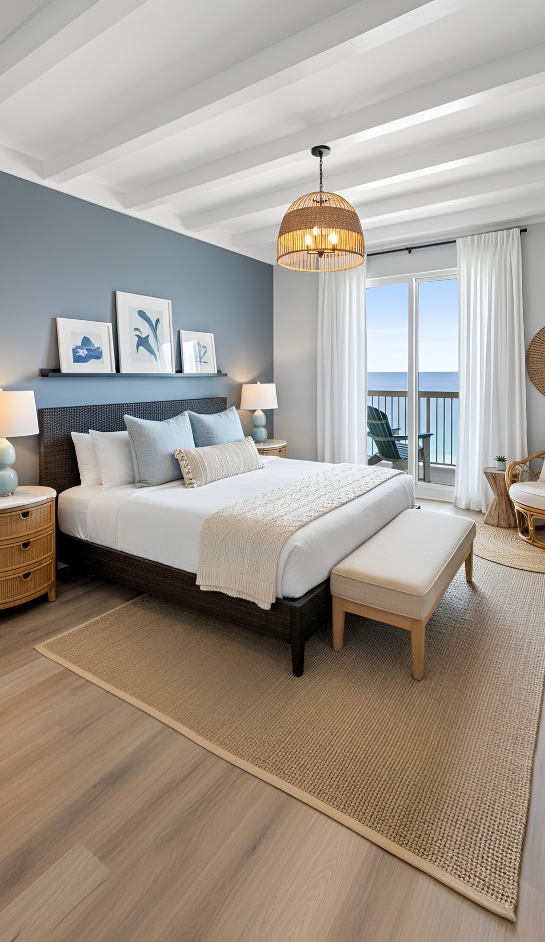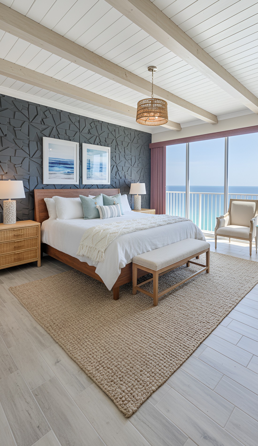 In a modern coastal bedroom, that statement should feel calm, not loud. It could be a beautiful oversized light fixture, a large piece of abstract ocean art, a dramatic headboard, or a stunning woven bench. This piece helps the room feel intentional and memorable.