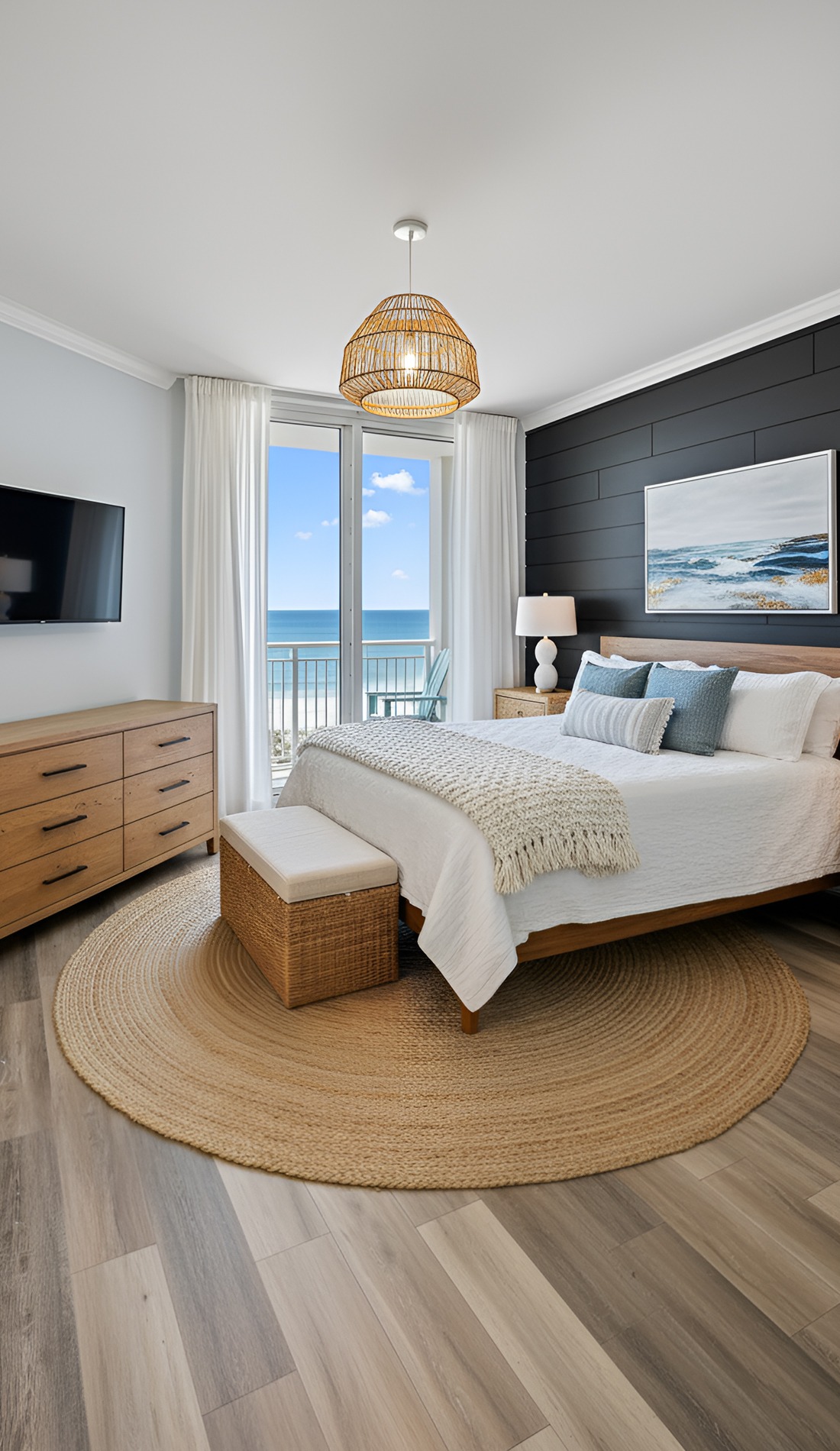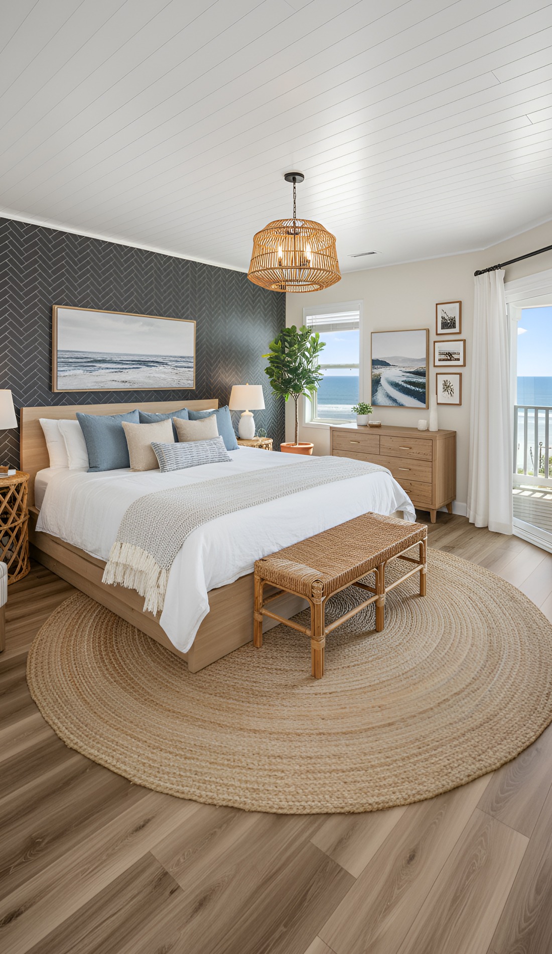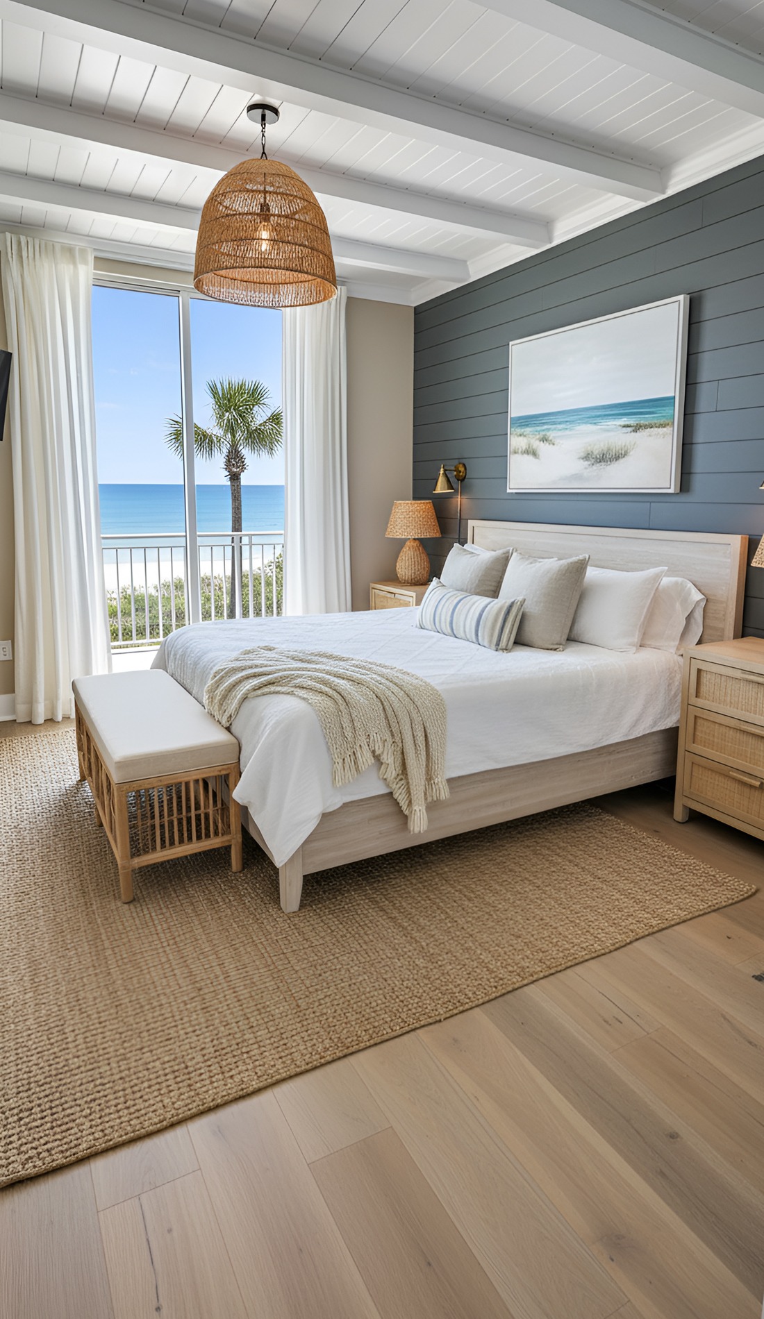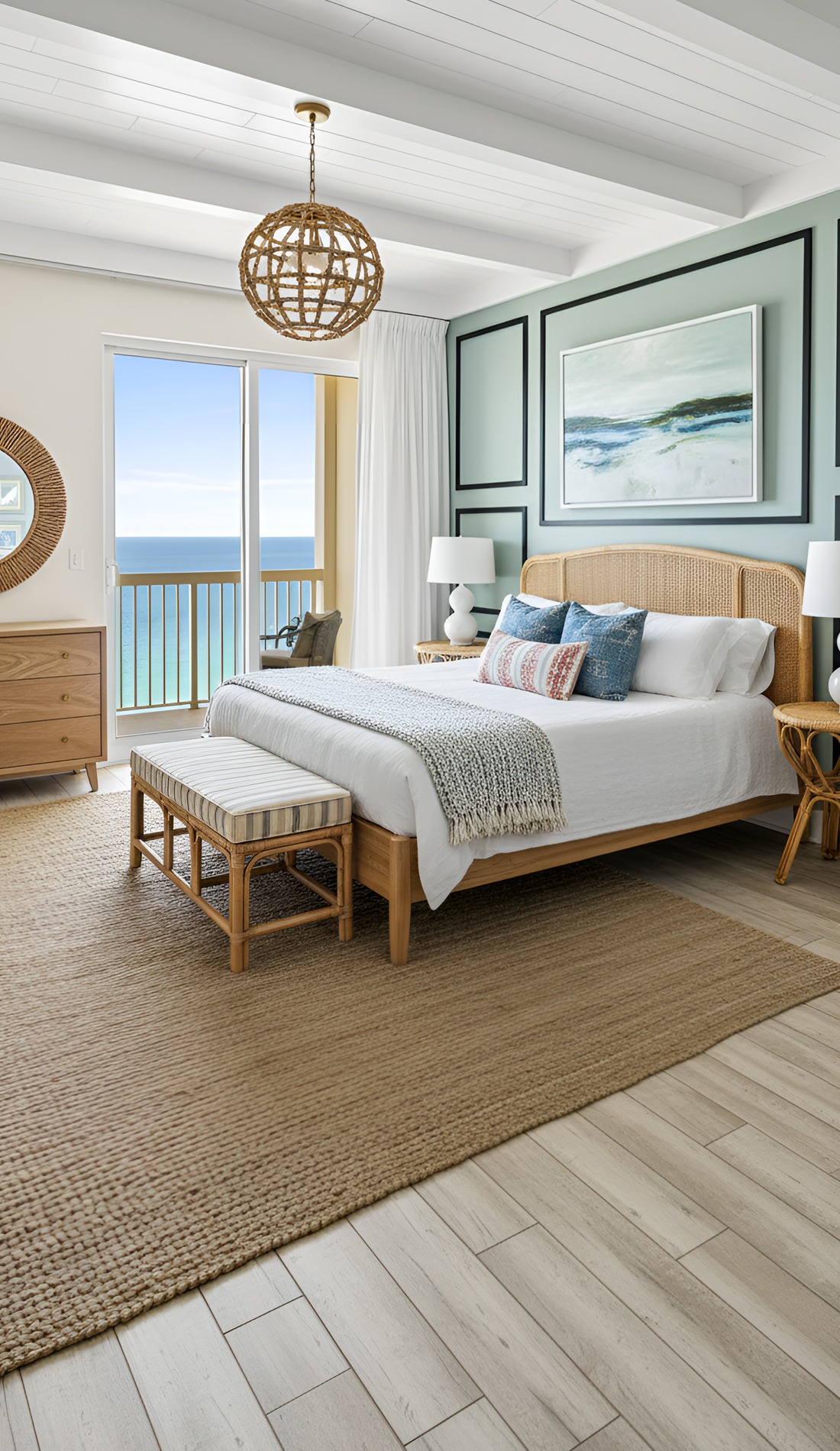 In a modern coastal bedroom, that statement should feel calm, not loud. It could be a beautiful oversized light fixture, a large piece of abstract ocean art, a dramatic headboard, or a stunning woven bench. This piece helps the room feel intentional and memorable.