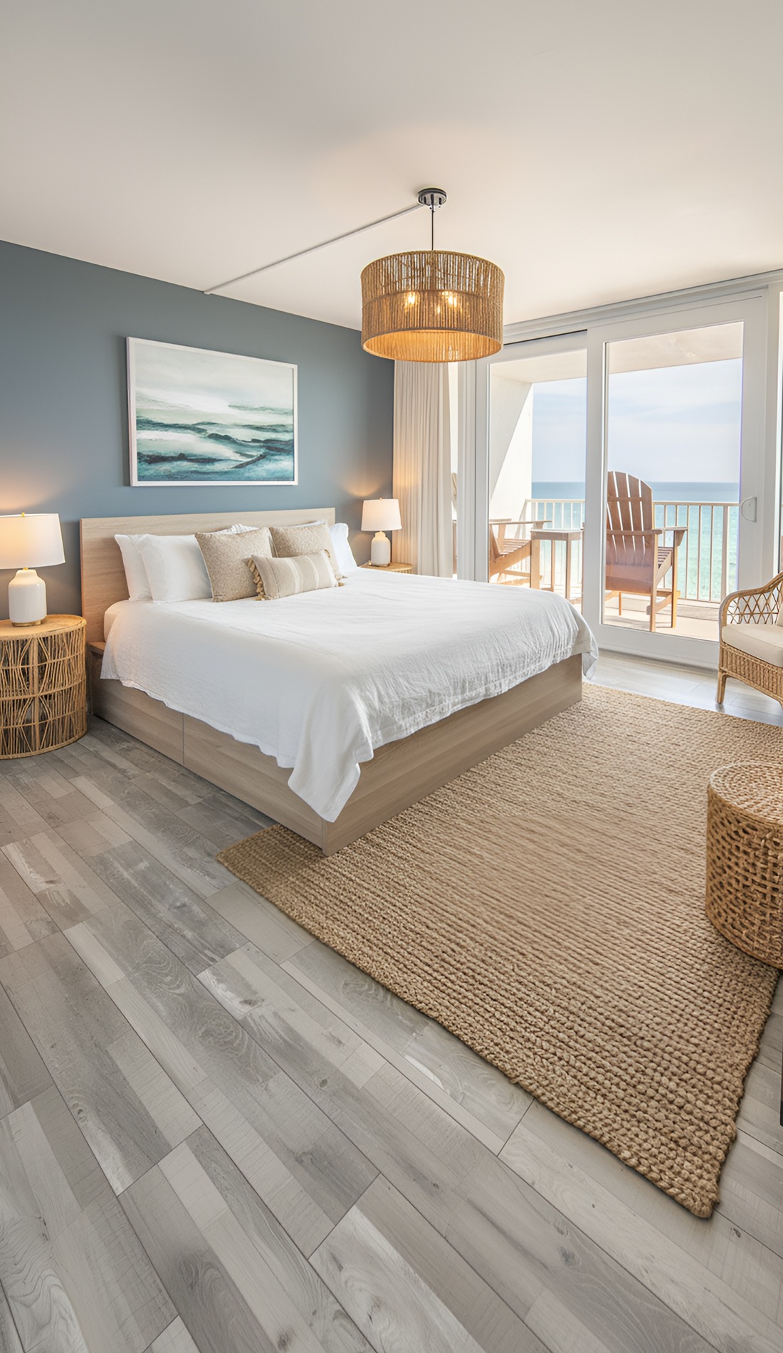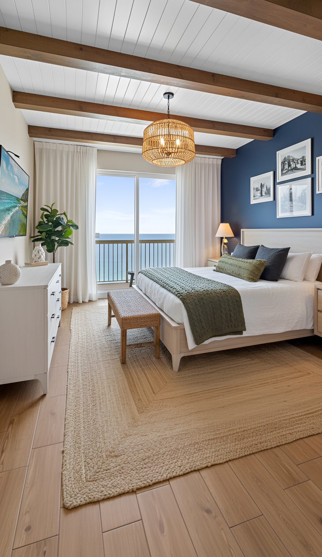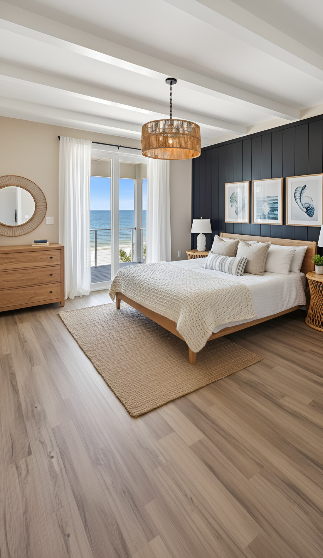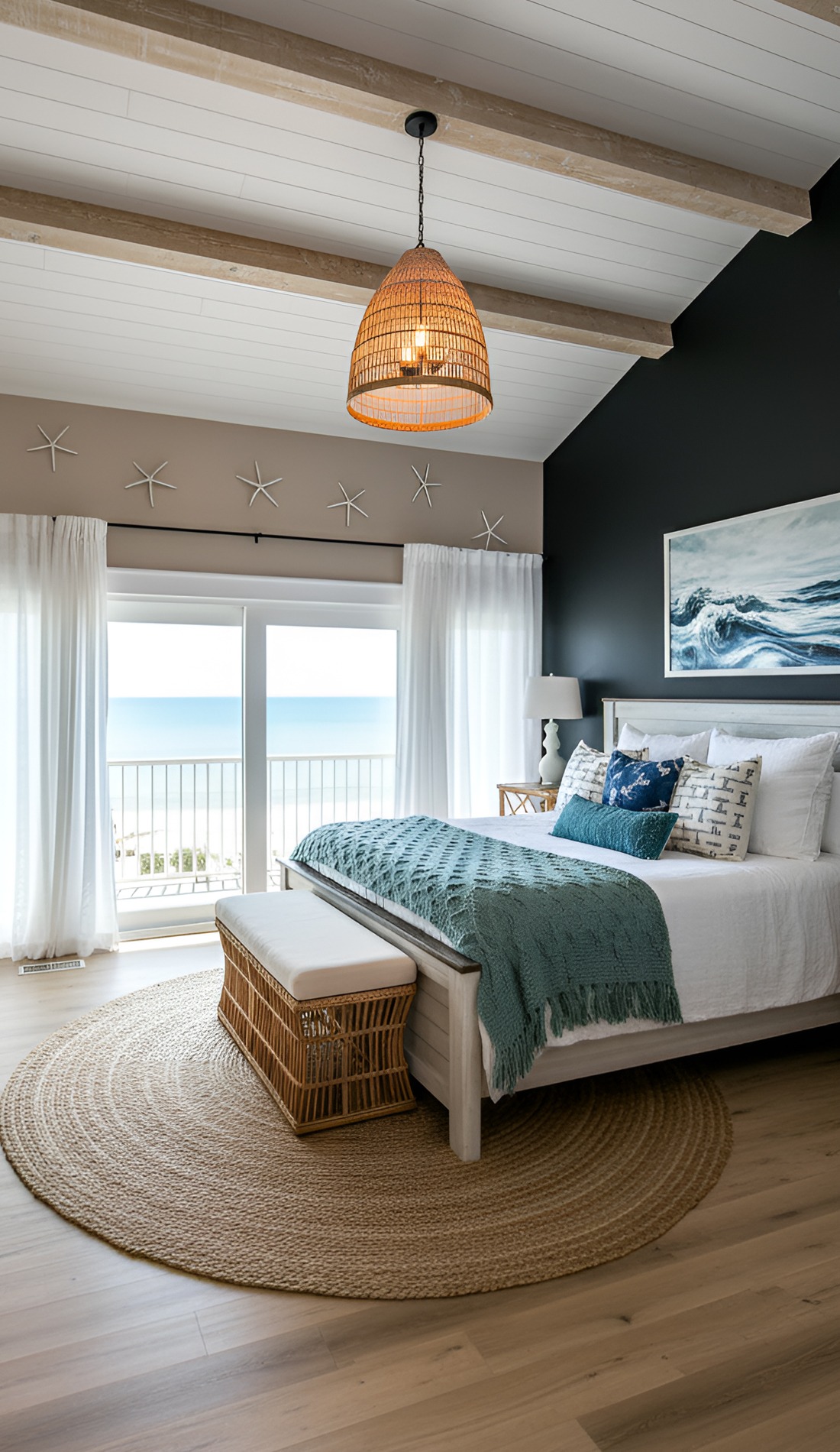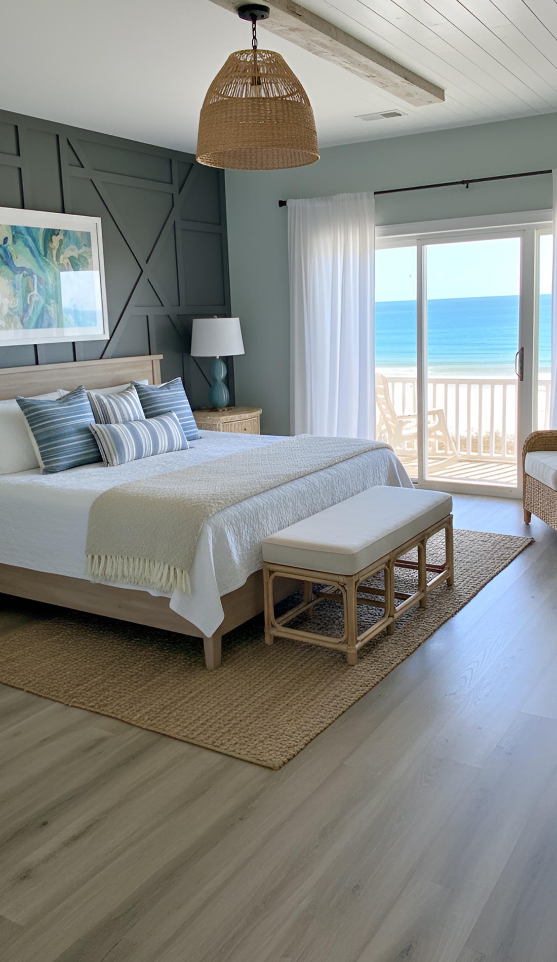 In a modern coastal bedroom, that statement should feel calm, not loud. It could be a beautiful oversized light fixture, a large piece of abstract ocean art, a dramatic headboard, or a stunning woven bench. This piece helps the room feel intentional and memorable.