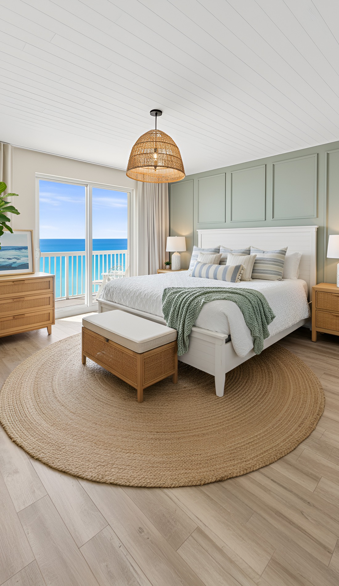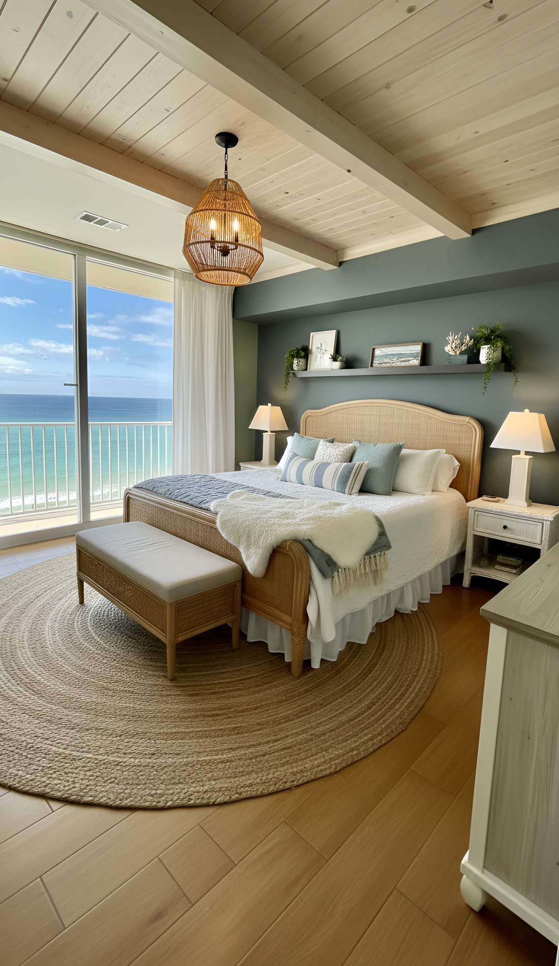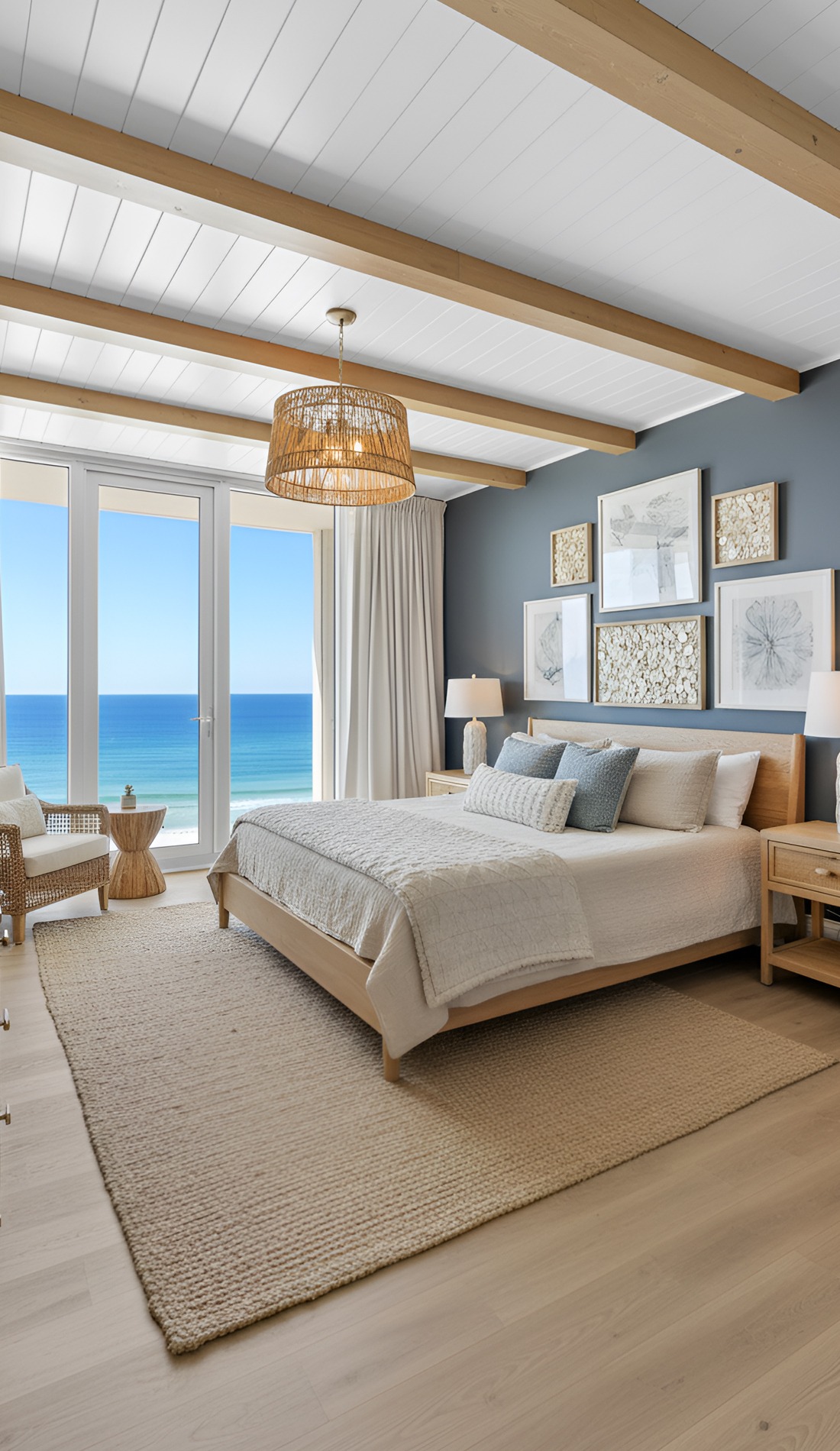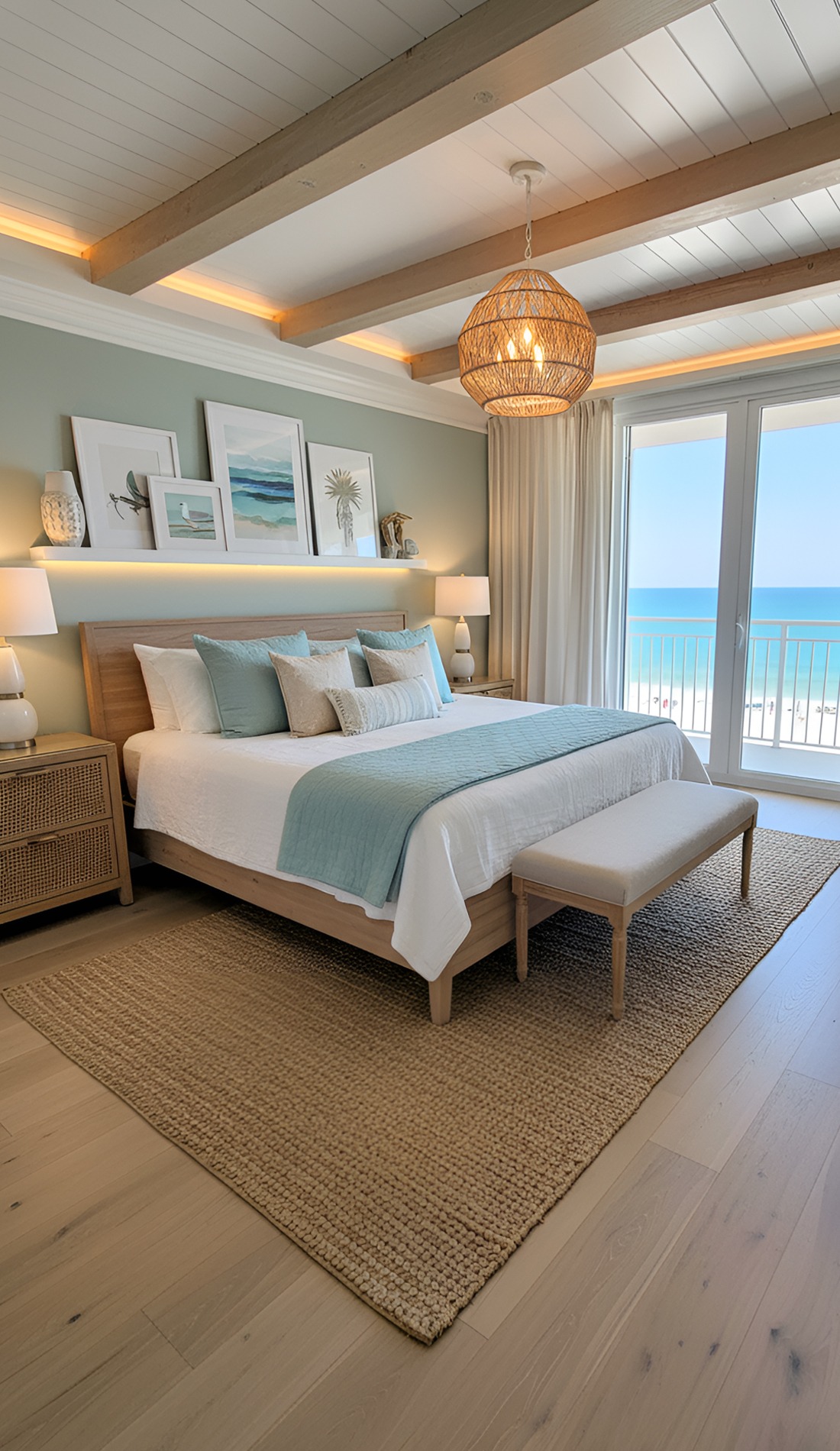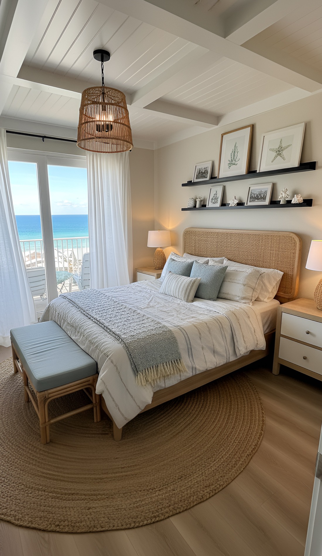 Start with your foundation. Choose a soft neutral wall color. Then pick bedding in white or ivory. After that, bring in light wood furniture and layer woven or linen textures. Add a few pale blue or sea-glass accents, but keep them limited. Use soft lighting, airy curtains, and simple decor. Finally, step back and edit.