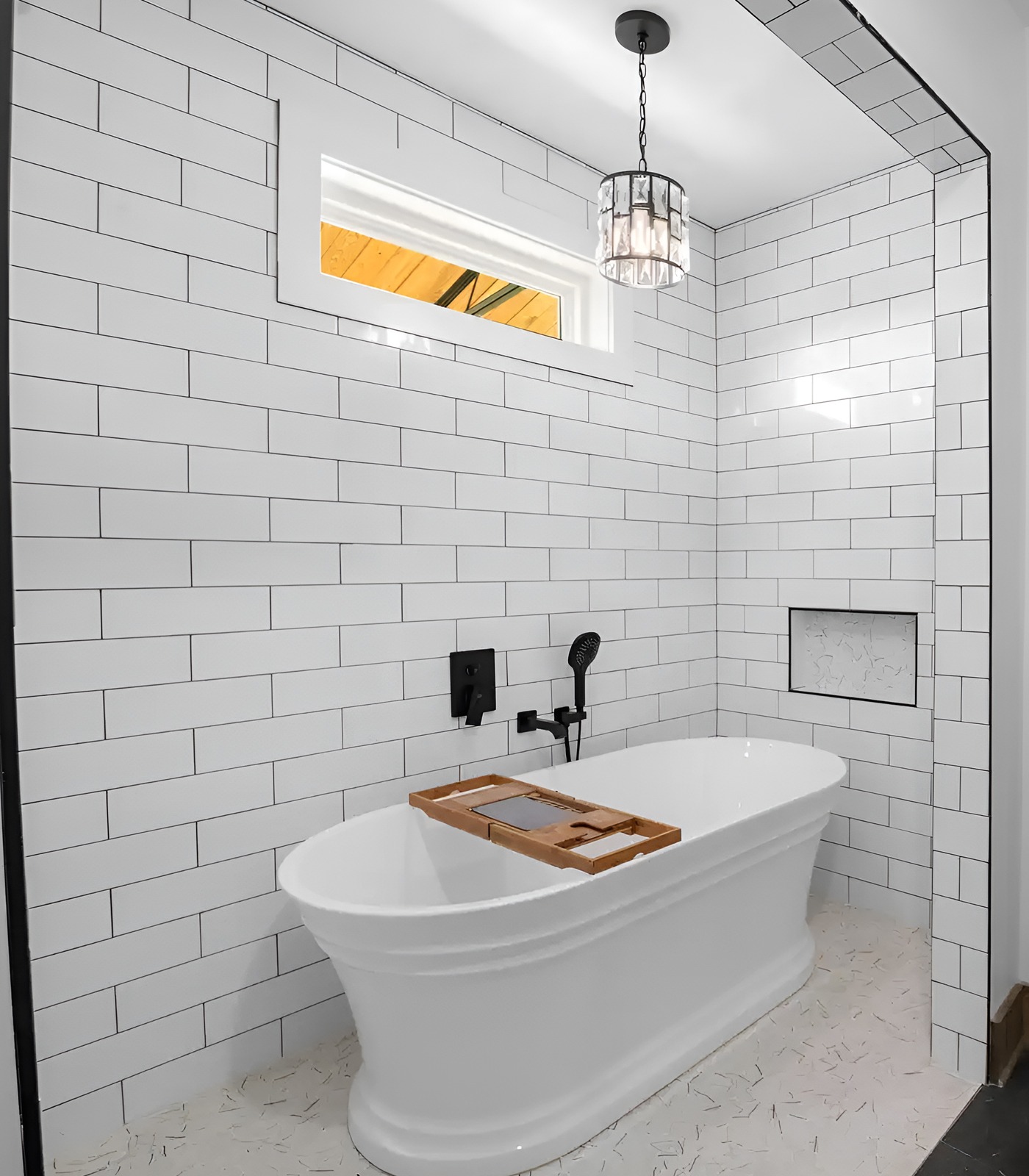 A luxury barndominium bathroom can feel clean and cozy at the same time. White subway tile gives the room a fresh base. A freestanding tub adds a spa feel. Black fixtures add a modern edge.