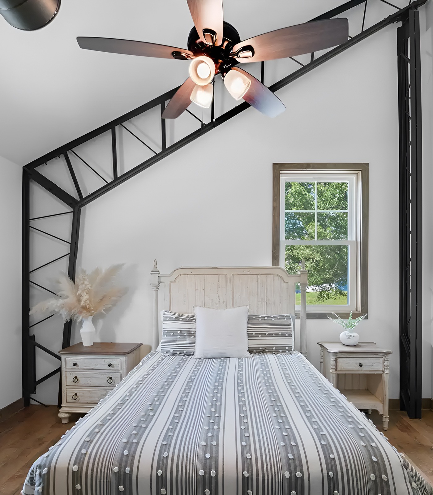 Black metal framing can add drama. But balance it with pale wood and soft textiles. A striped bedspread, white pillows, and natural dried stems can make the room feel relaxed.
