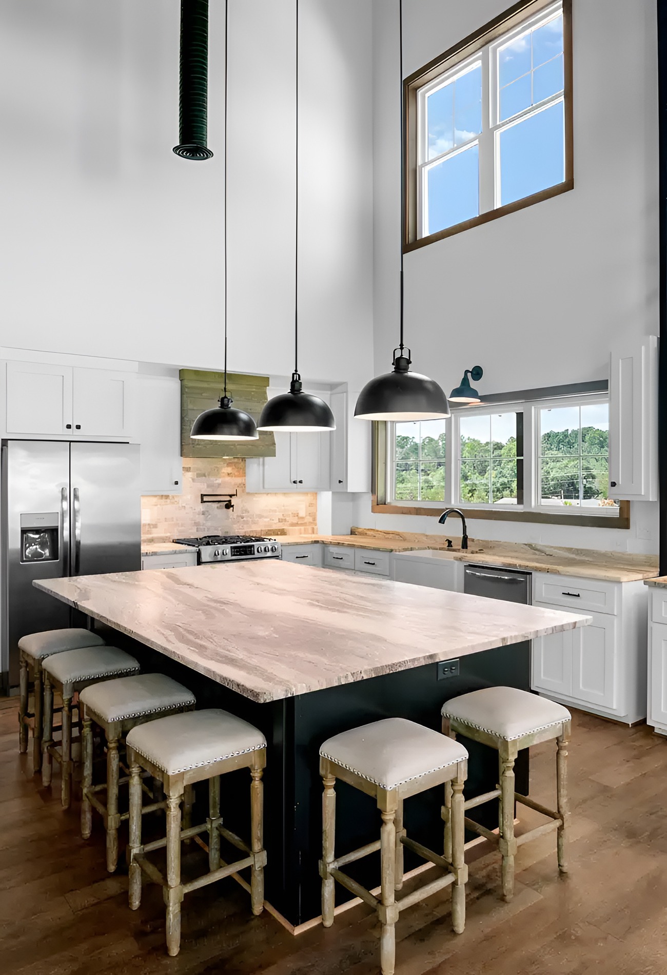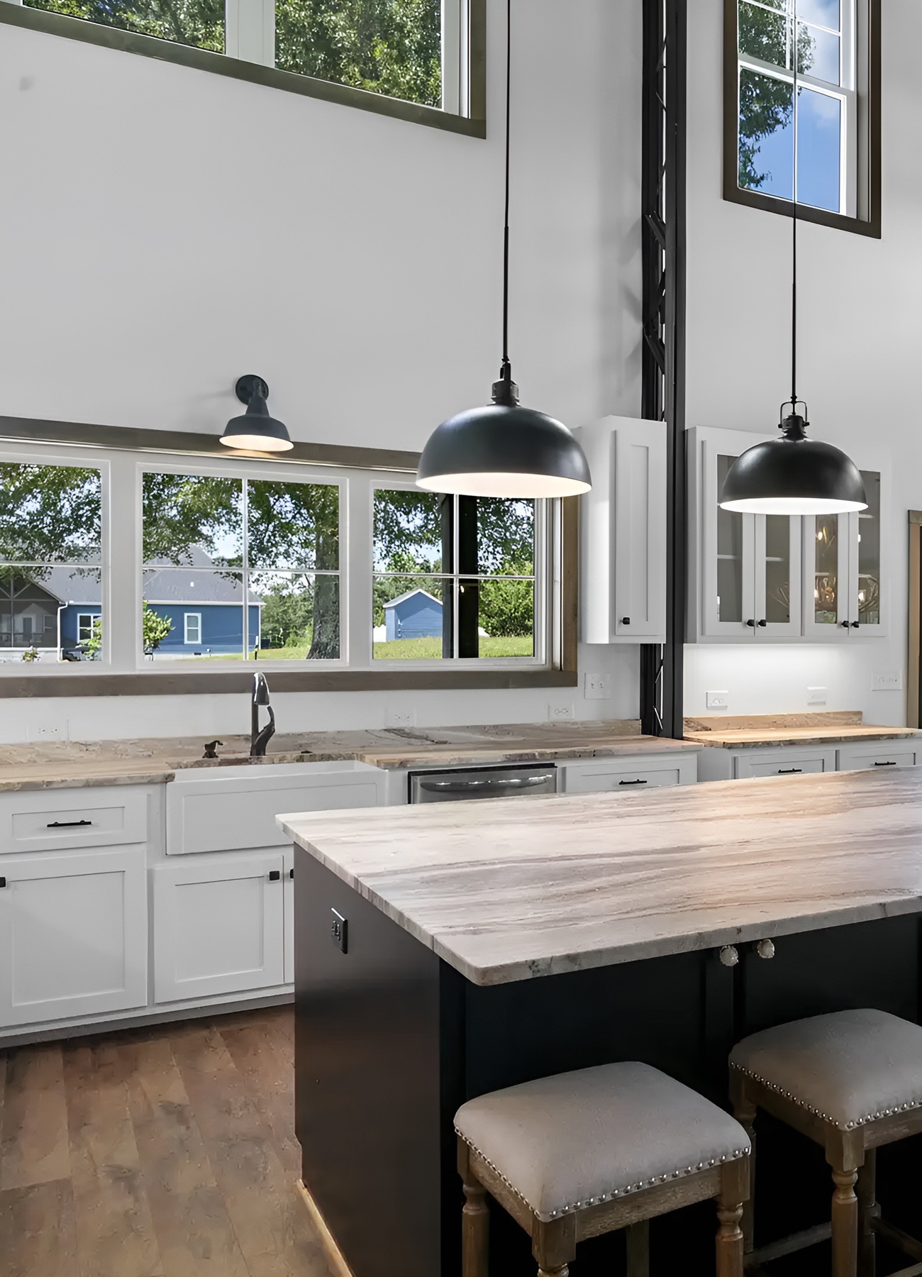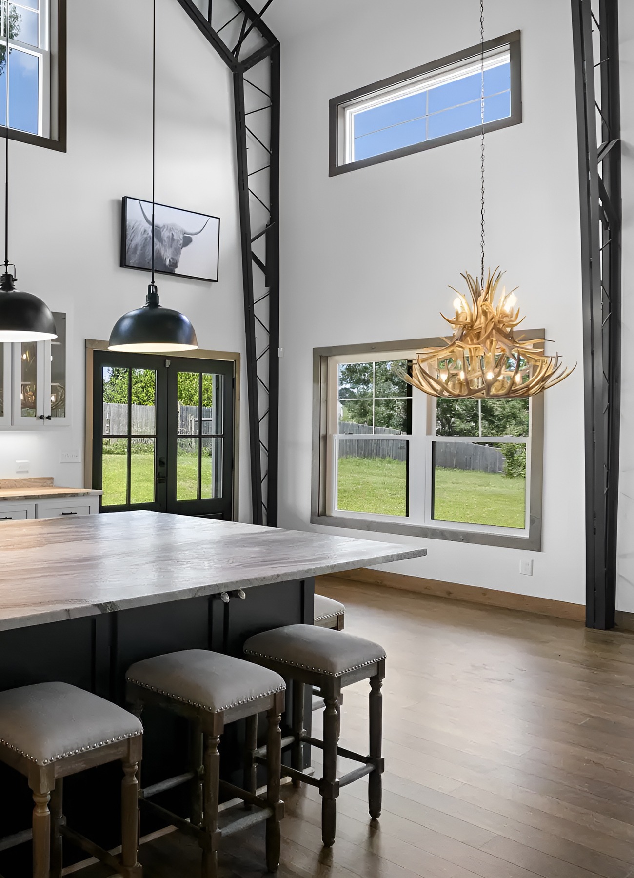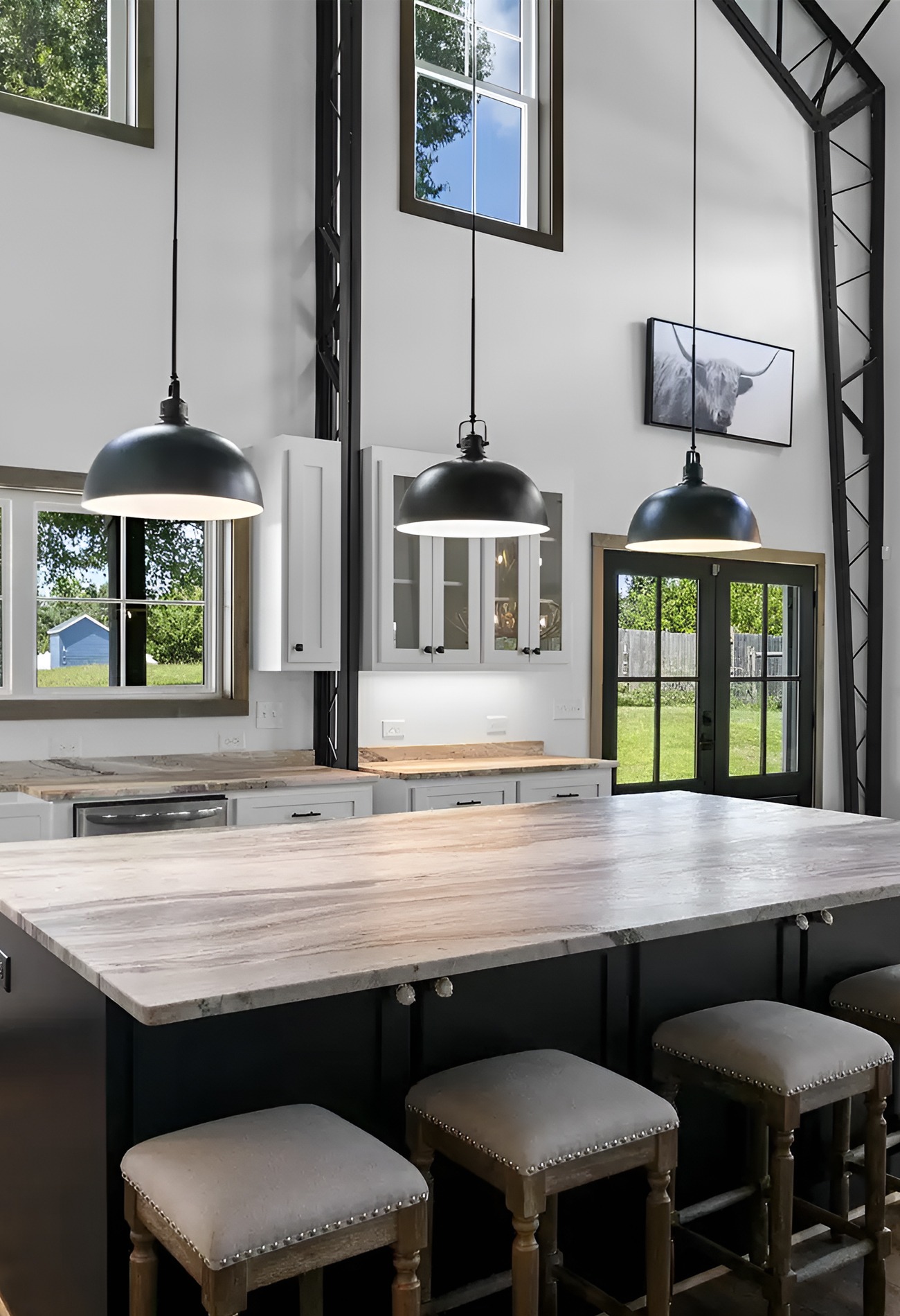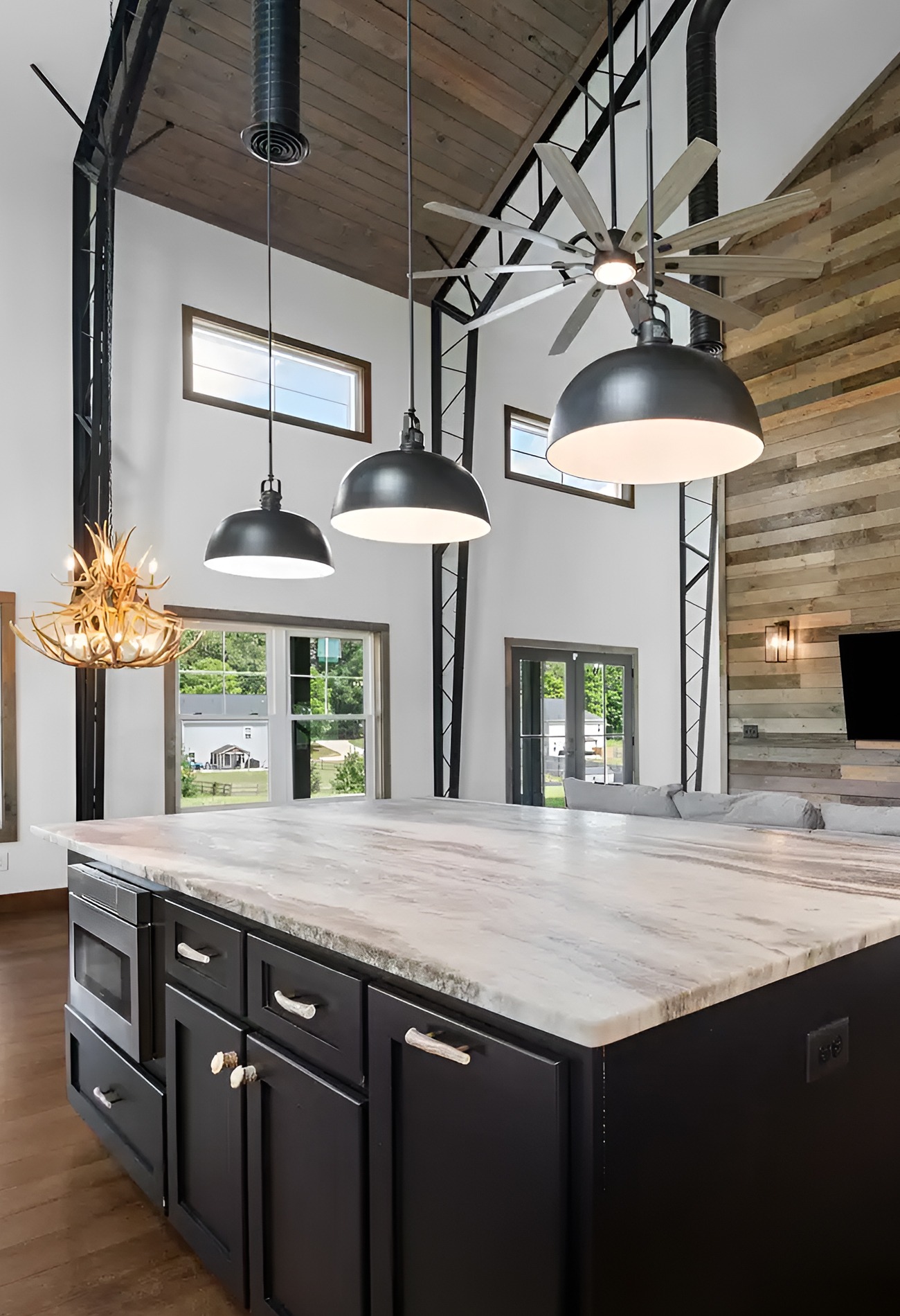 Lighting matters in a tall barndominium. Small fixtures can get lost. Oversized black pendants help fill the height and bring the eye down toward the island.