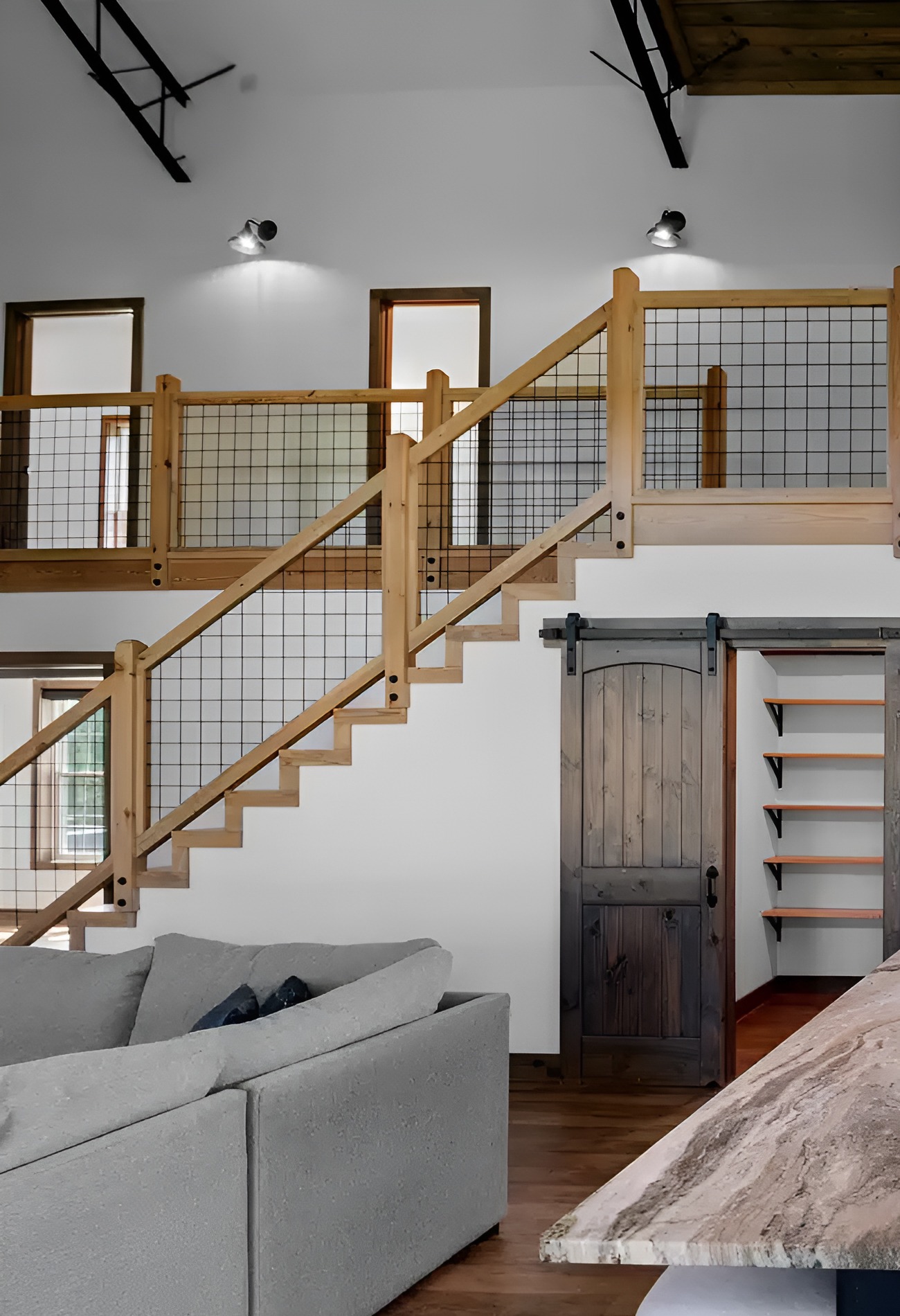 A staircase can do more than connect two floors. In a barndominium, it can become a major design feature. A wood staircase with simple rails feels warm and inviting.