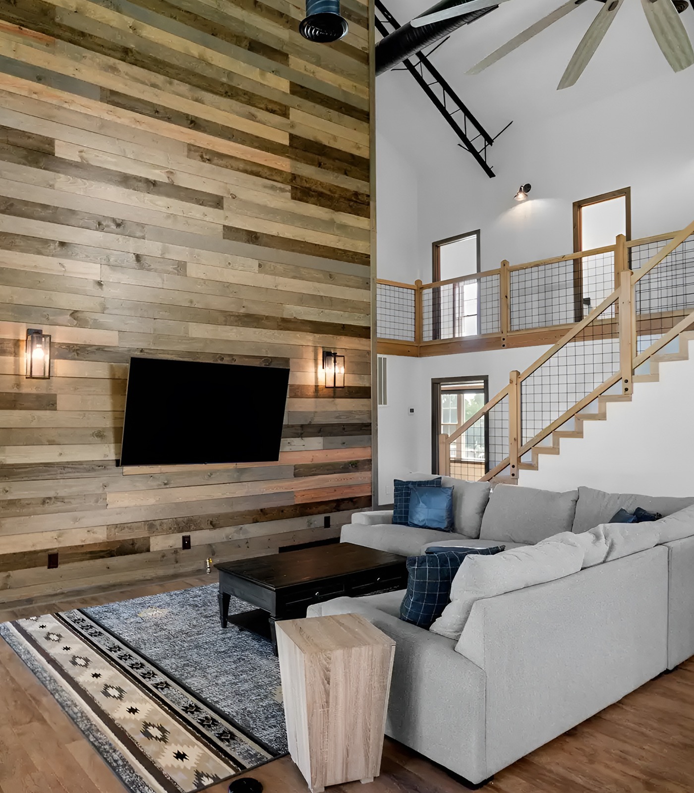Use the loft for bedrooms, a reading nook, an office, or a guest space. Keep the railing open so light can pass through. Wood posts with wire mesh or metal panels create a rustic-modern look.