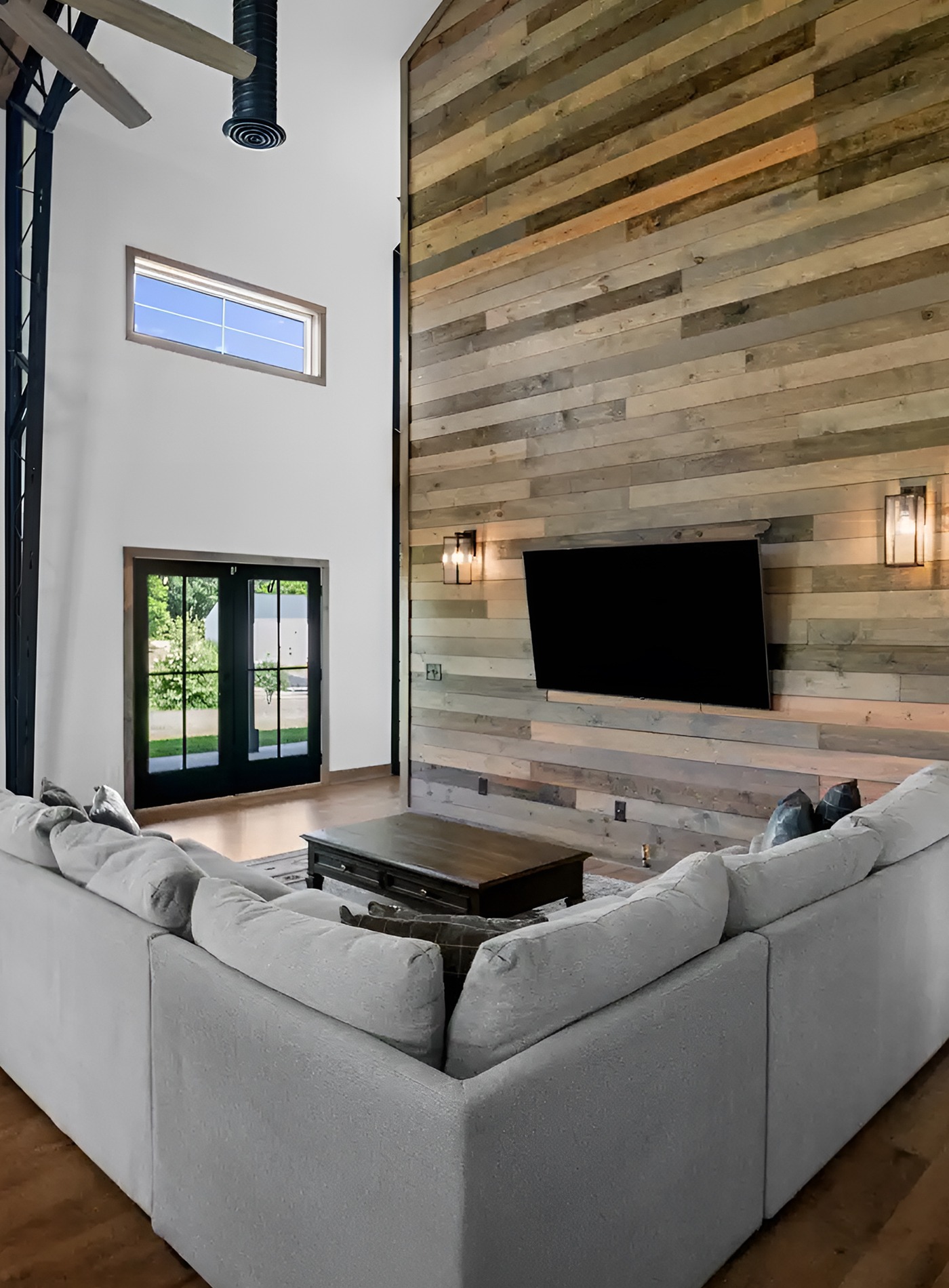 A mounted TV can sit on the wood wall without taking over the room. Add wall sconces on each side to give the area a soft glow at night.