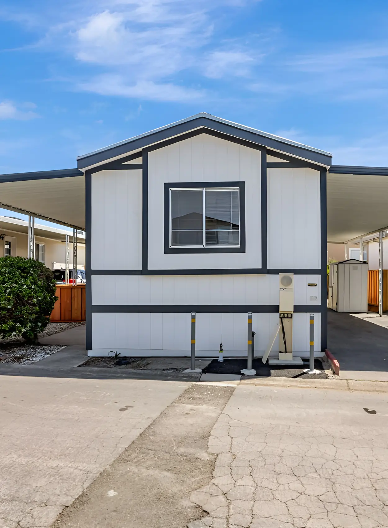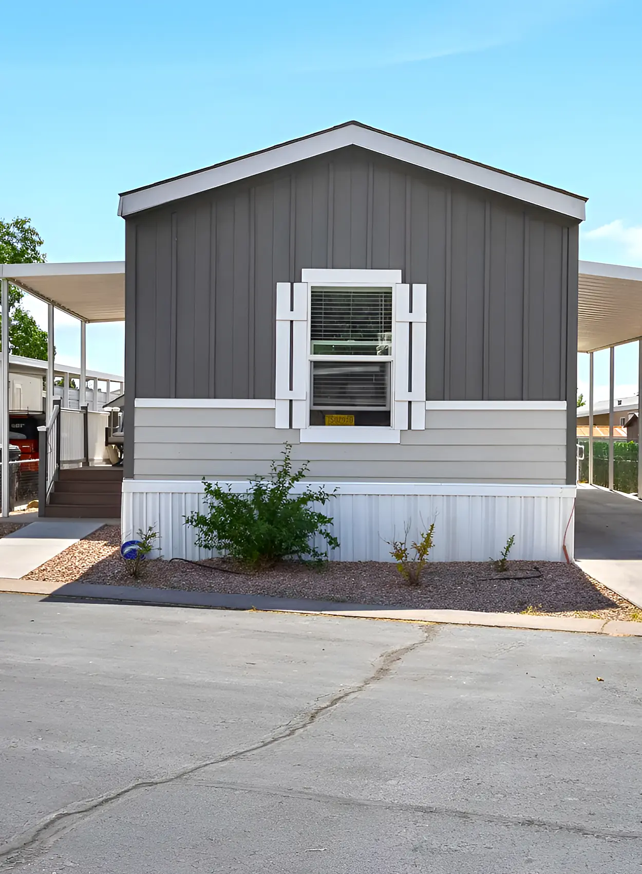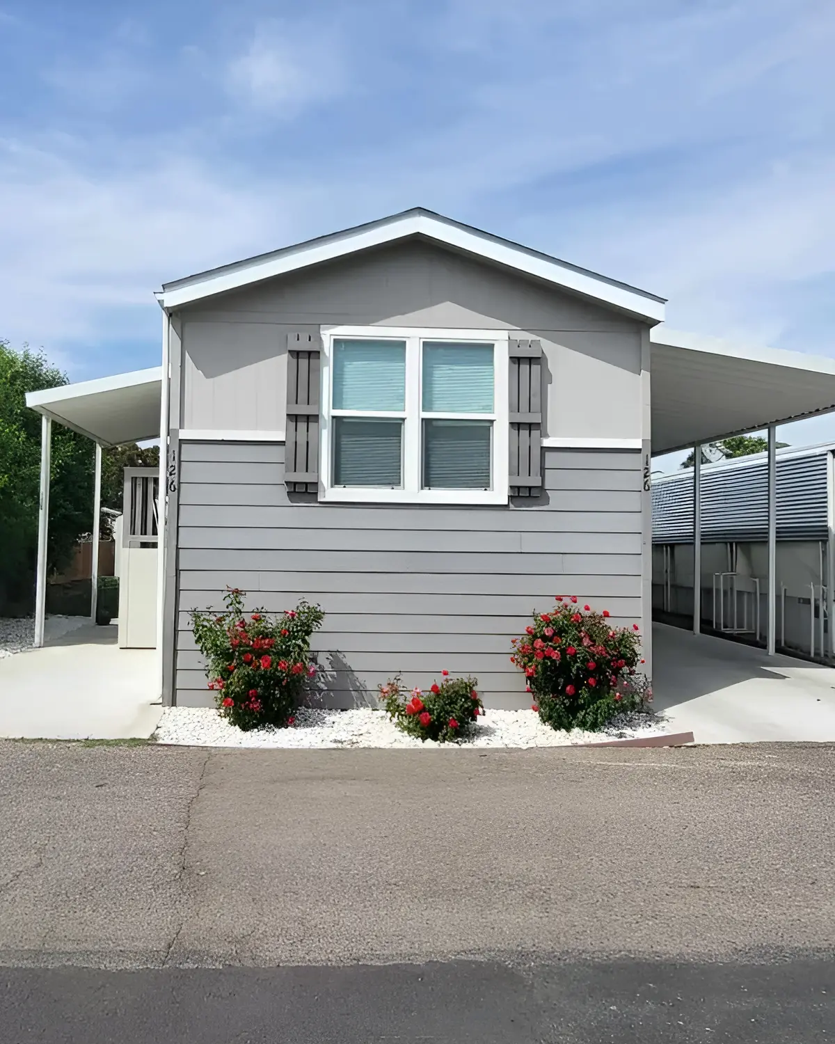 This home uses a warm peach beige that feels soft in the sun. It gives the exterior a friendly, relaxed look. The white skirting and trim keep it clean, while the carports on both sides create shade and balance.