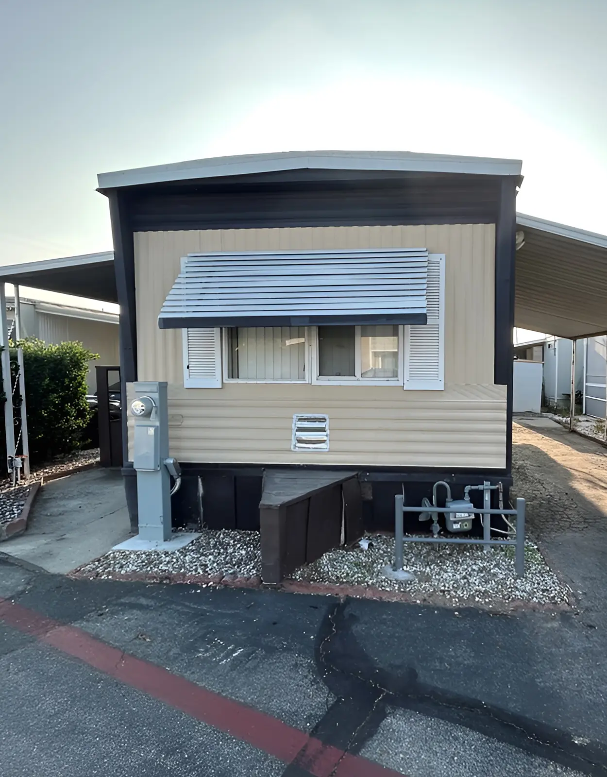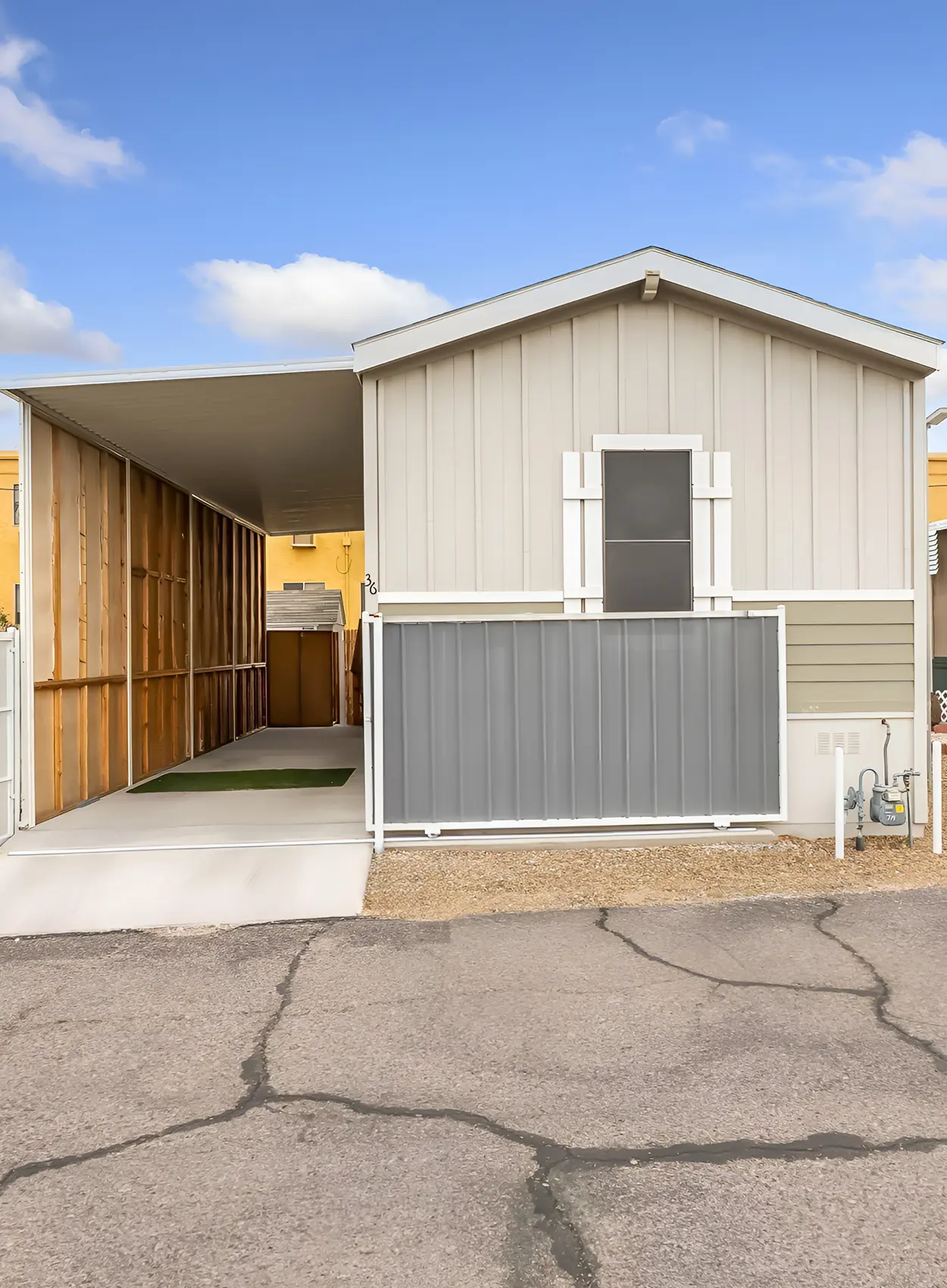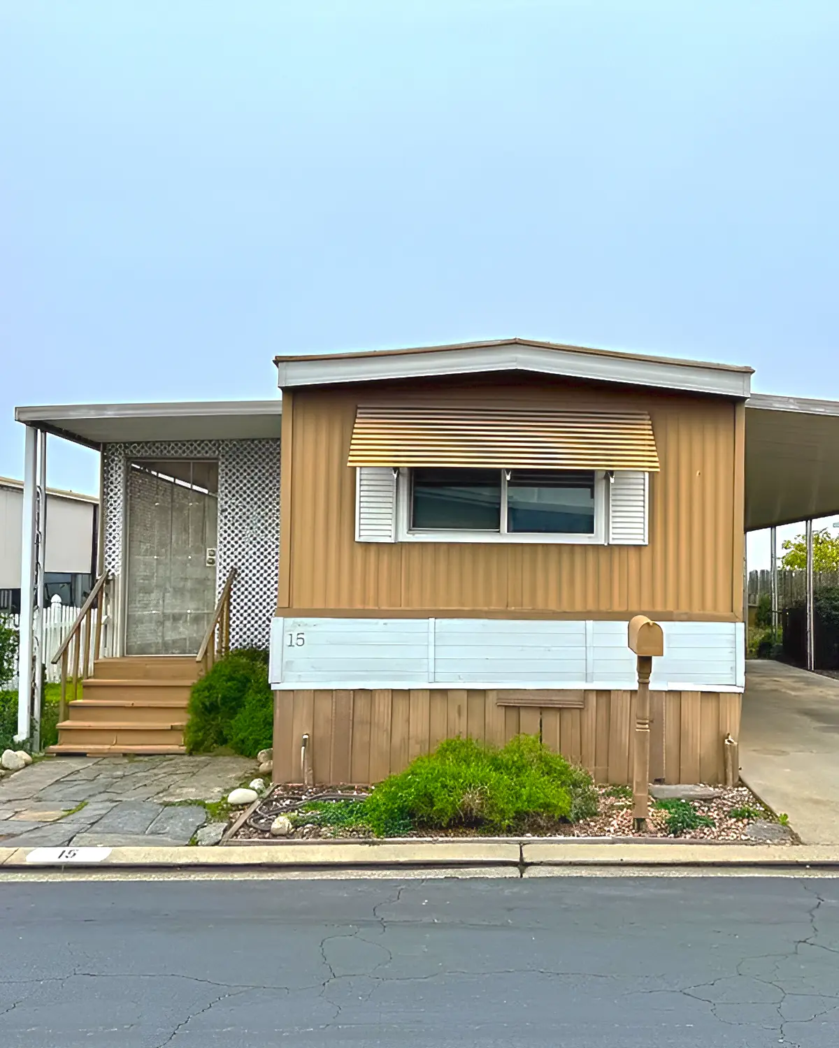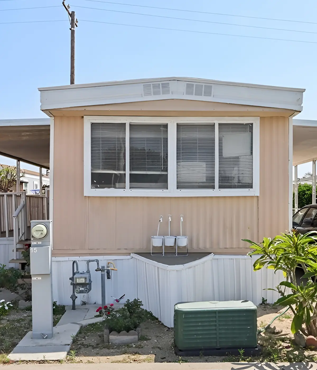 This home uses a warm peach beige that feels soft in the sun. It gives the exterior a friendly, relaxed look. The white skirting and trim keep it clean, while the carports on both sides create shade and balance.