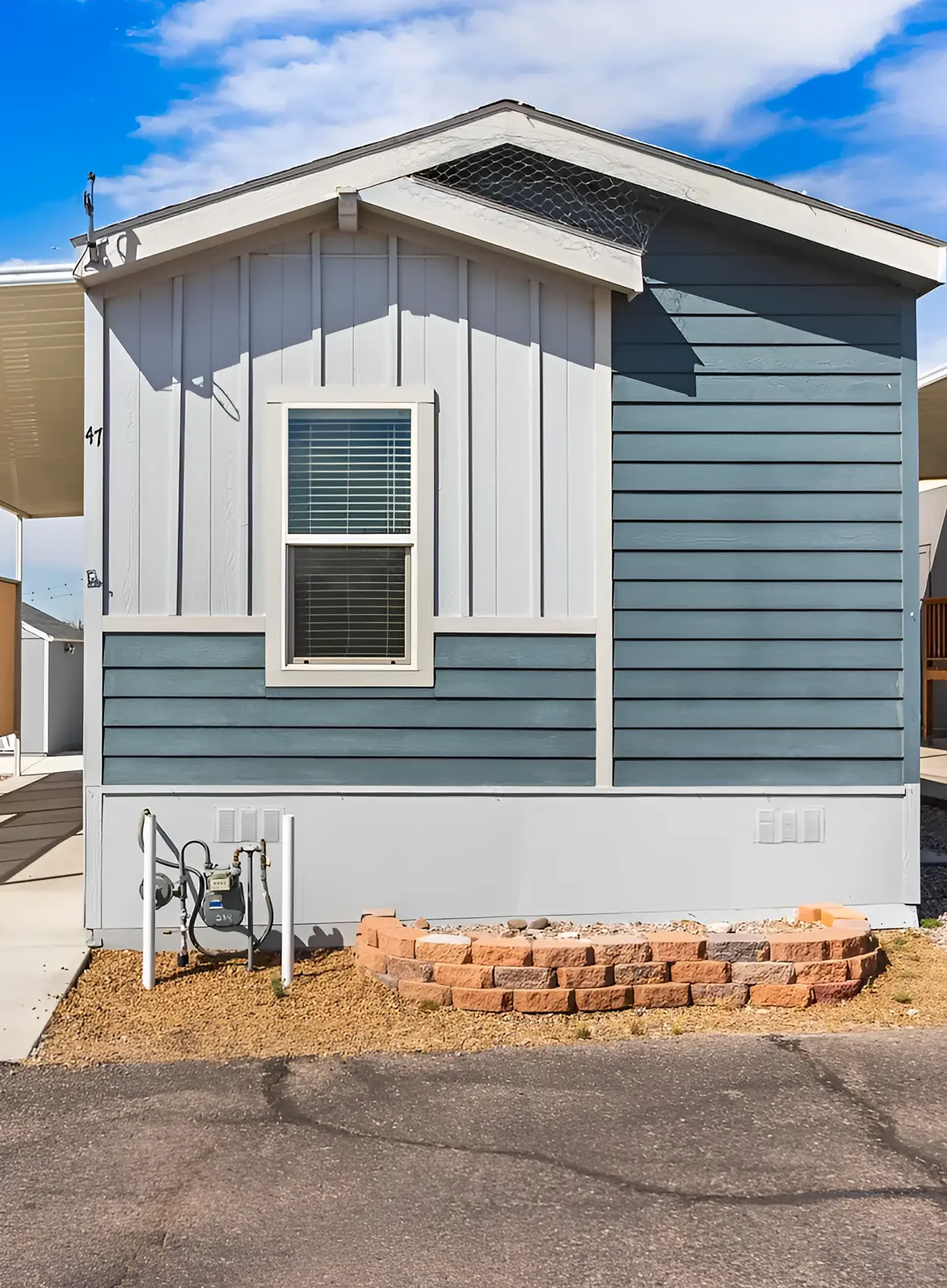 The white trim pulls everything together. It outlines the window, roof edge, and skirting. The small brick planter adds warmth, so the cool blue does not feel too cold. This is a great idea for anyone who wants color but still wants the home to feel crisp and bright.