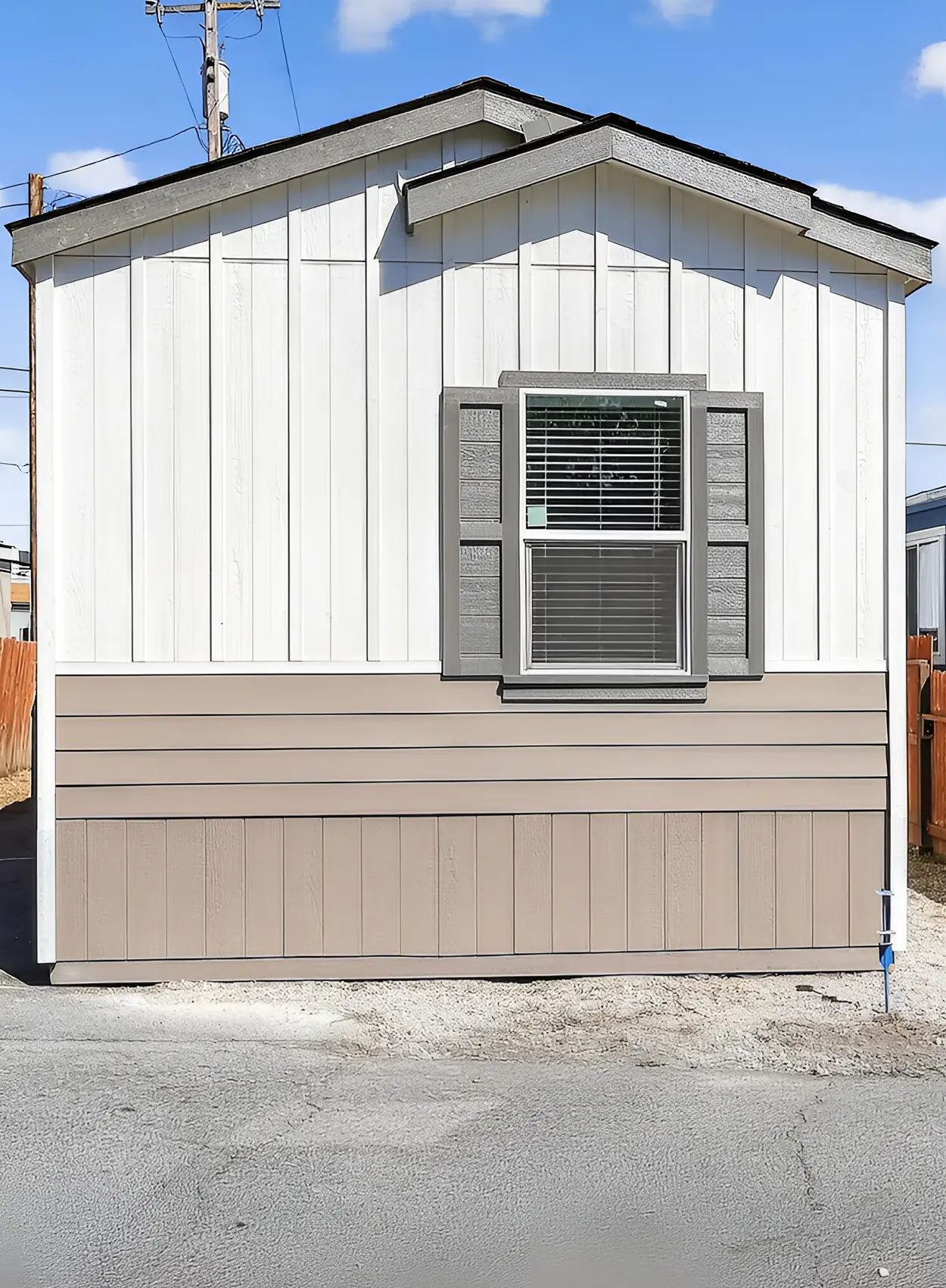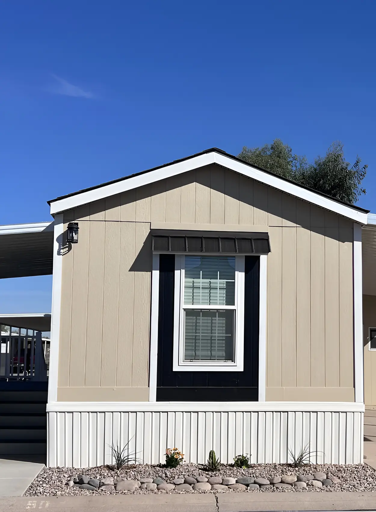 This home uses a warm tan body with black trim. It has a practical desert look, but the black trim gives it more structure. The dark trim around the roofline and window awning helps define the shape of the home. That is key for a simple single wide exterior.