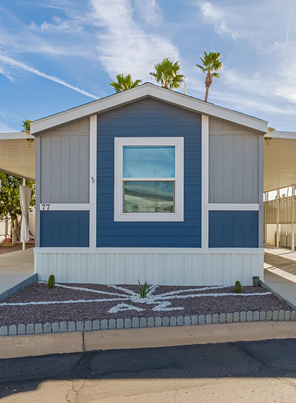 This home uses a warm desert clay color with olive taupe accents. It feels earthy and natural. The white skirting gives the palette a clean lift, while the carport adds shade and balance.