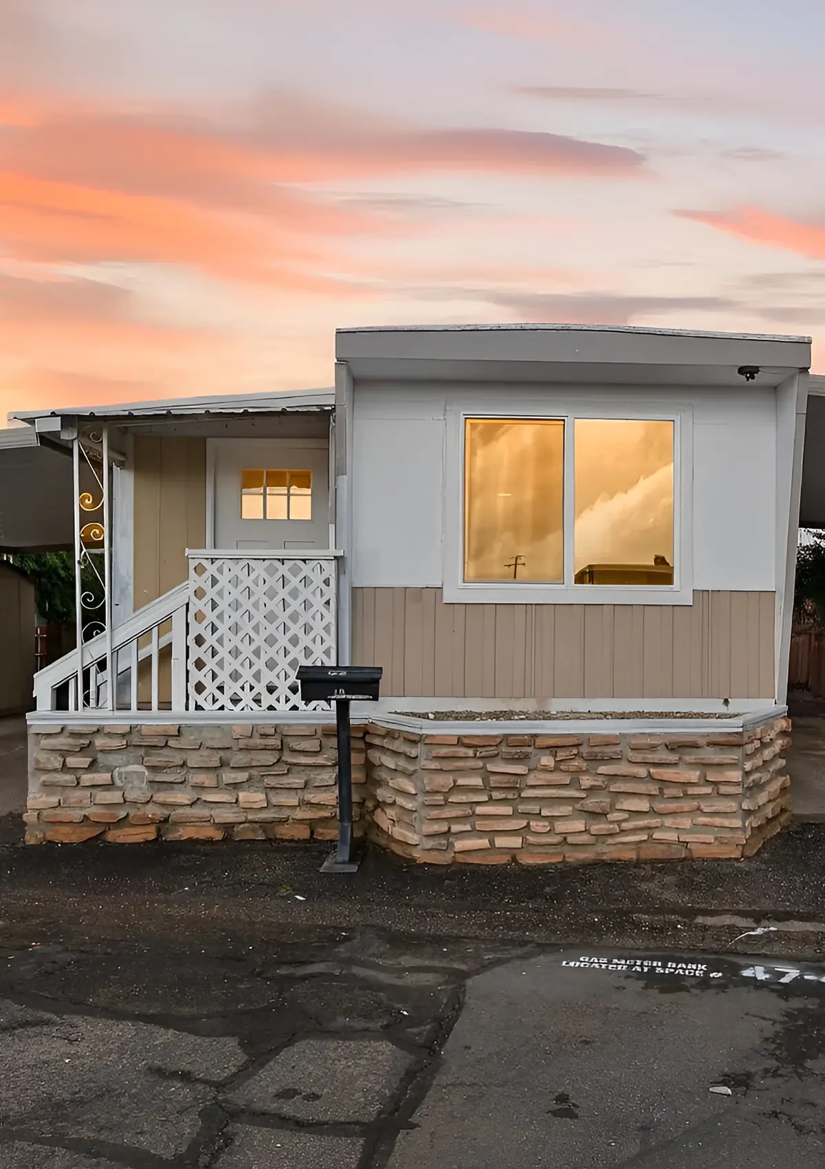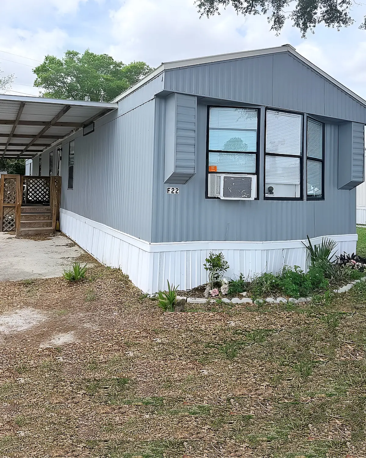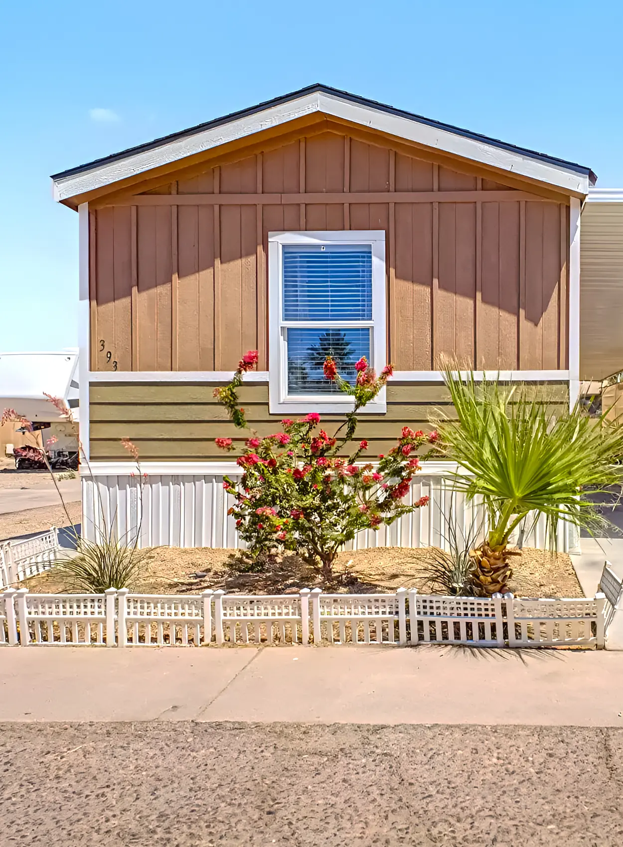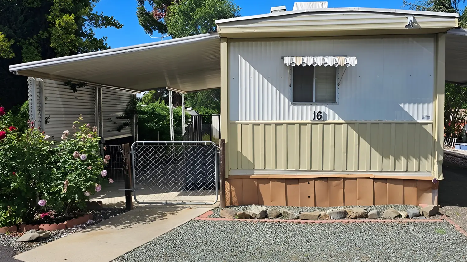 The tan awning over the window blends with the siding, so the front feels soft and calm. The lattice near the porch adds a classic park-home detail. This palette works well when you want a traditional look that feels tidy and easy to maintain.