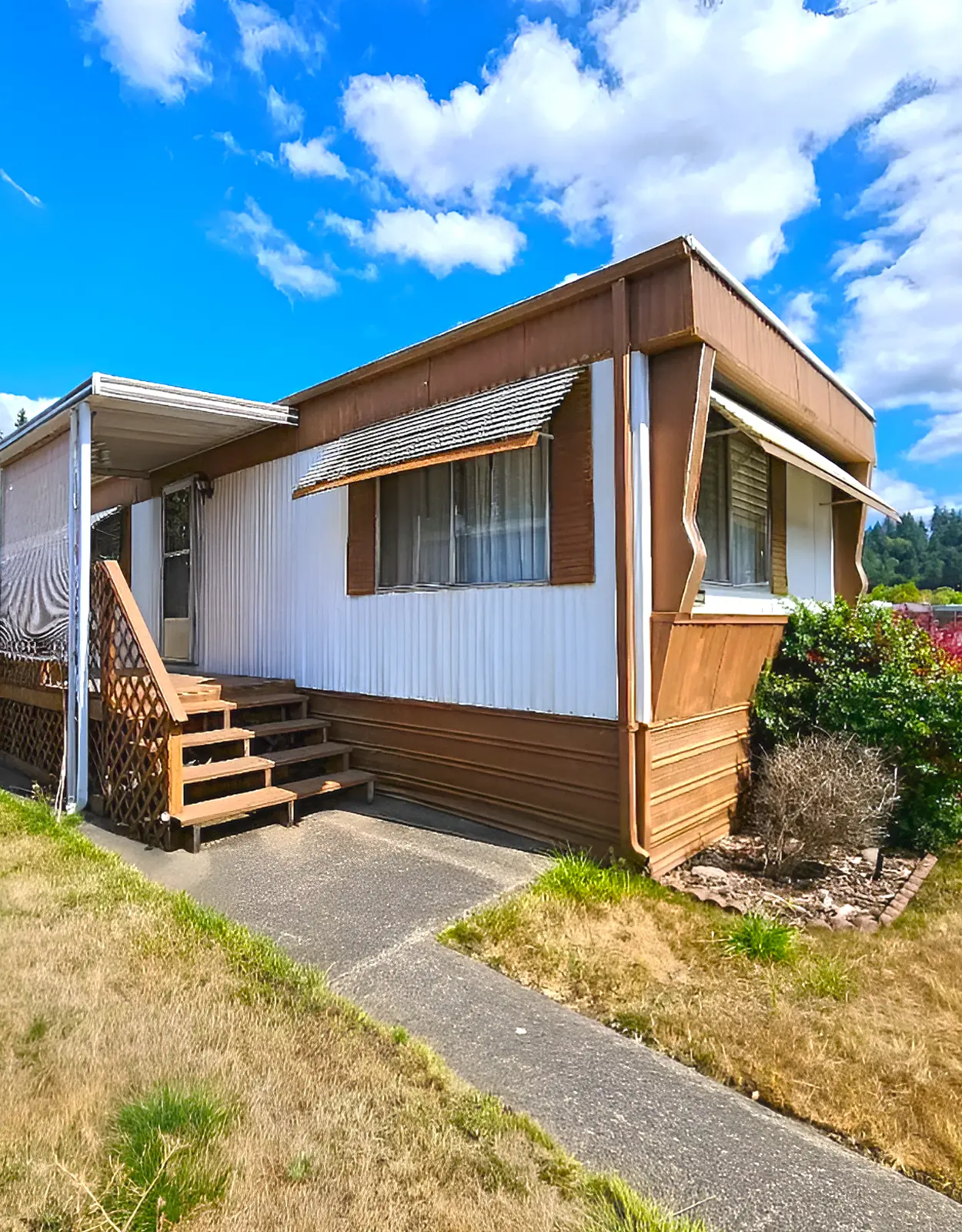 This home has a classic vintage mobile home palette. The cocoa brown trim, cream siding, and tan lower panels create a warm retro look. Instead of hiding the age of the home, the colors lean into it in a cozy way. That gives the exterior personality.