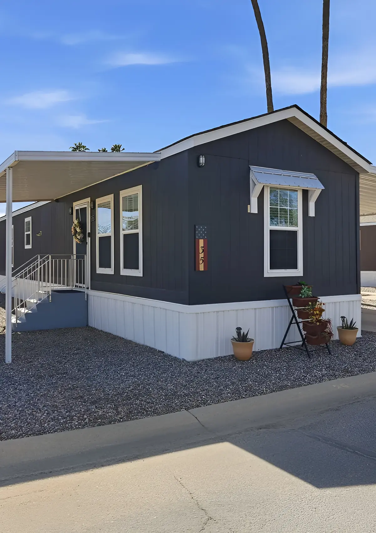 This color combo gives the home a clean modern farmhouse look. The deep charcoal siding feels bold, but it does not feel heavy because the white trim and white skirting brighten the whole base. The vertical siding also helps the home feel taller. That is a great trick for a single wide because it draws the eye upward instead of only across the length of the home.
