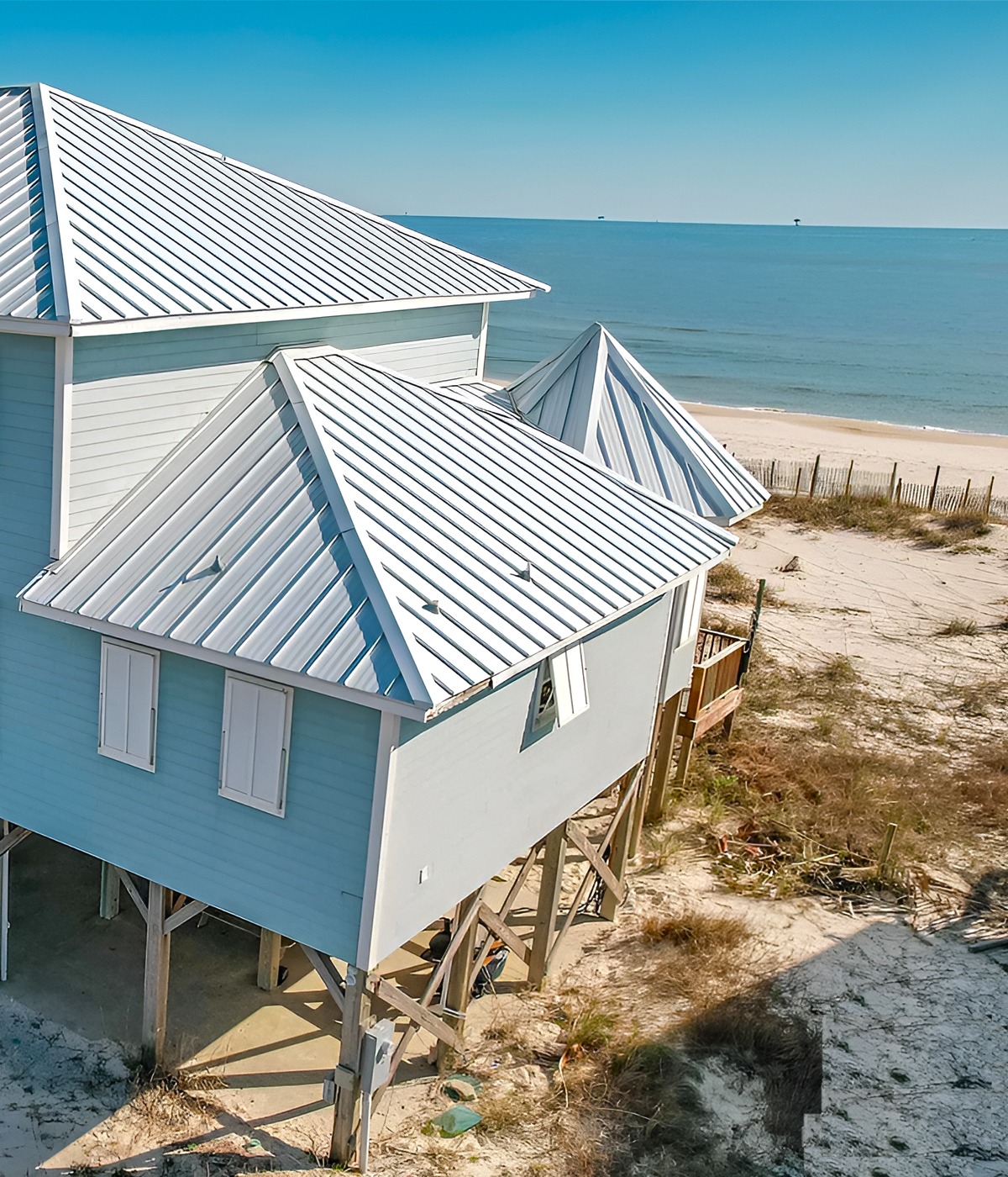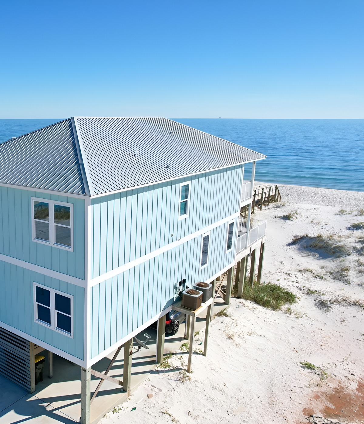 Last up, this beachfront beauty mixes classic lines with a pop of color. Tall, bold blue shutters shade the giant windows. The big deck stretches right over the sand, offering endless places to relax and soak in the sea air. Metal roofing tops it all off, ensuring durability and a crisp look.