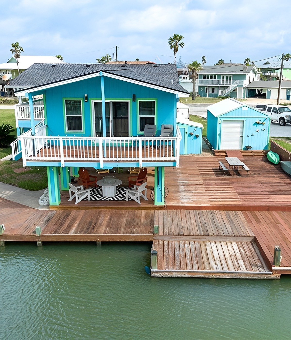 The first house grabs your attention right away. The exterior pops with bright turquoise siding and crisp white trim. Large decks stretch over the water, giving you plenty of space for relaxing and gathering with friends. Down below, comfy chairs circle a fire pit—perfect for sunset chats. There’s room for a kayak, sun loungers, and even outdoor dining. Big sliding doors and lots of windows keep the vibe cheerful and breezy.