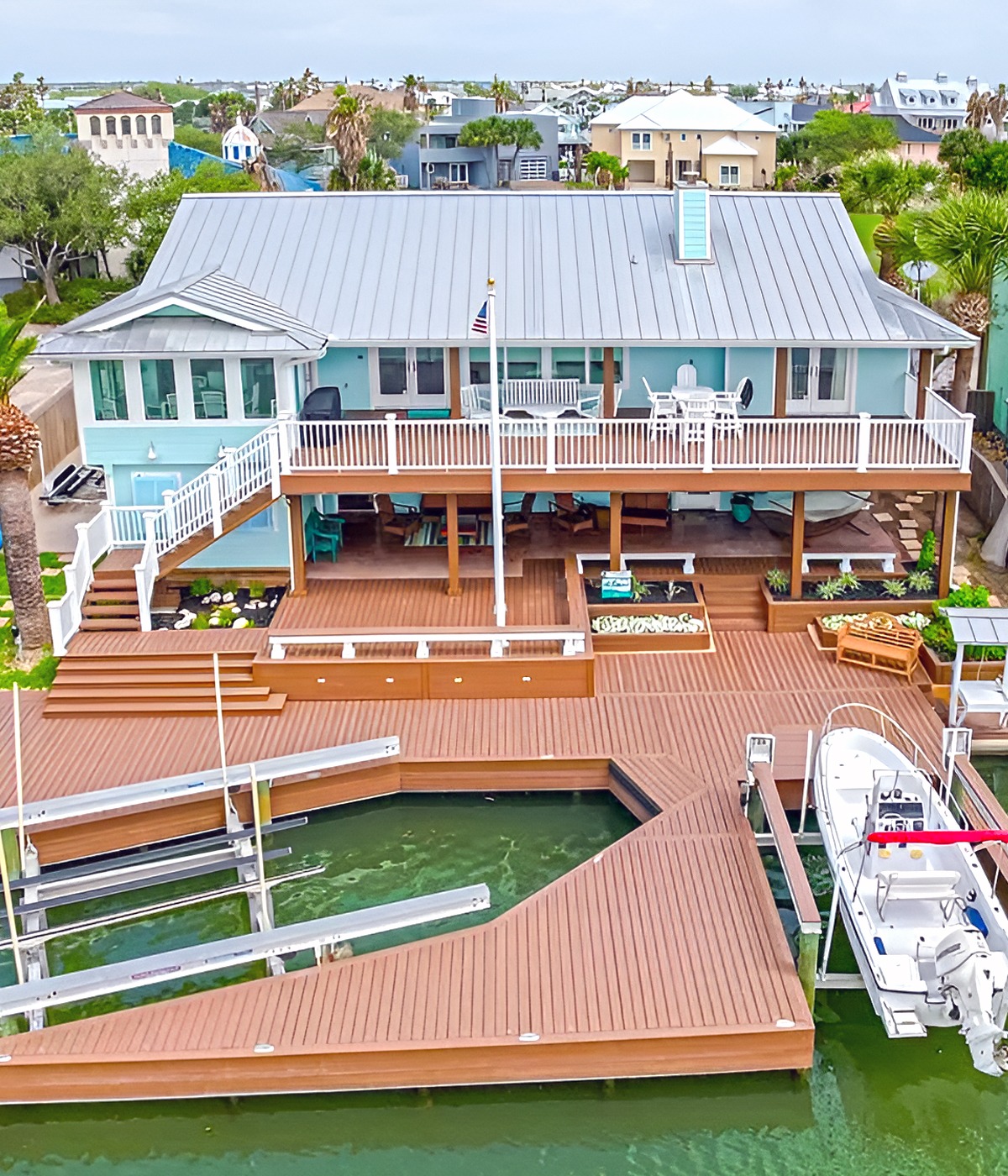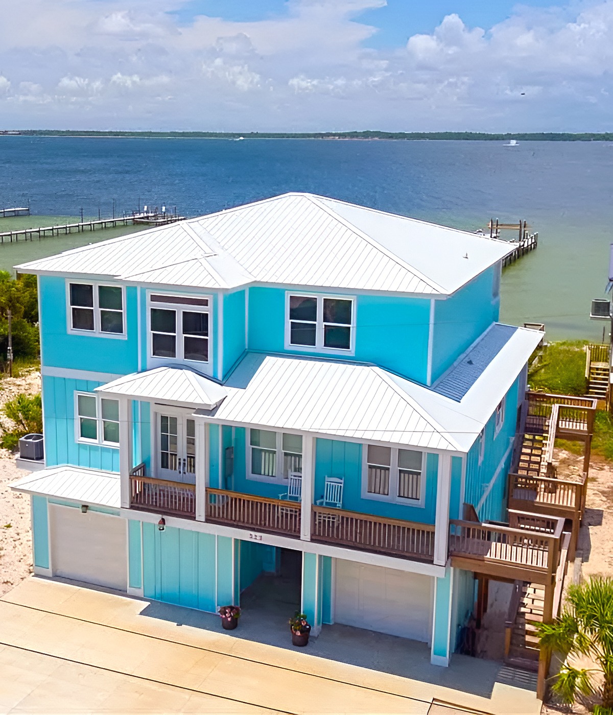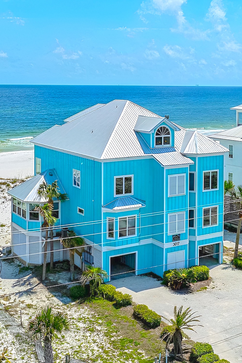Here’s a home that blends elegance with classic beach house style. Tall and modern, it features wide decks on every level—so you never miss a sunset. White railings pop against the blue-green siding, and metal roofing adds a coastal farmhouse feel. Palm trees sway in the breeze, and the water sparkles just steps away.