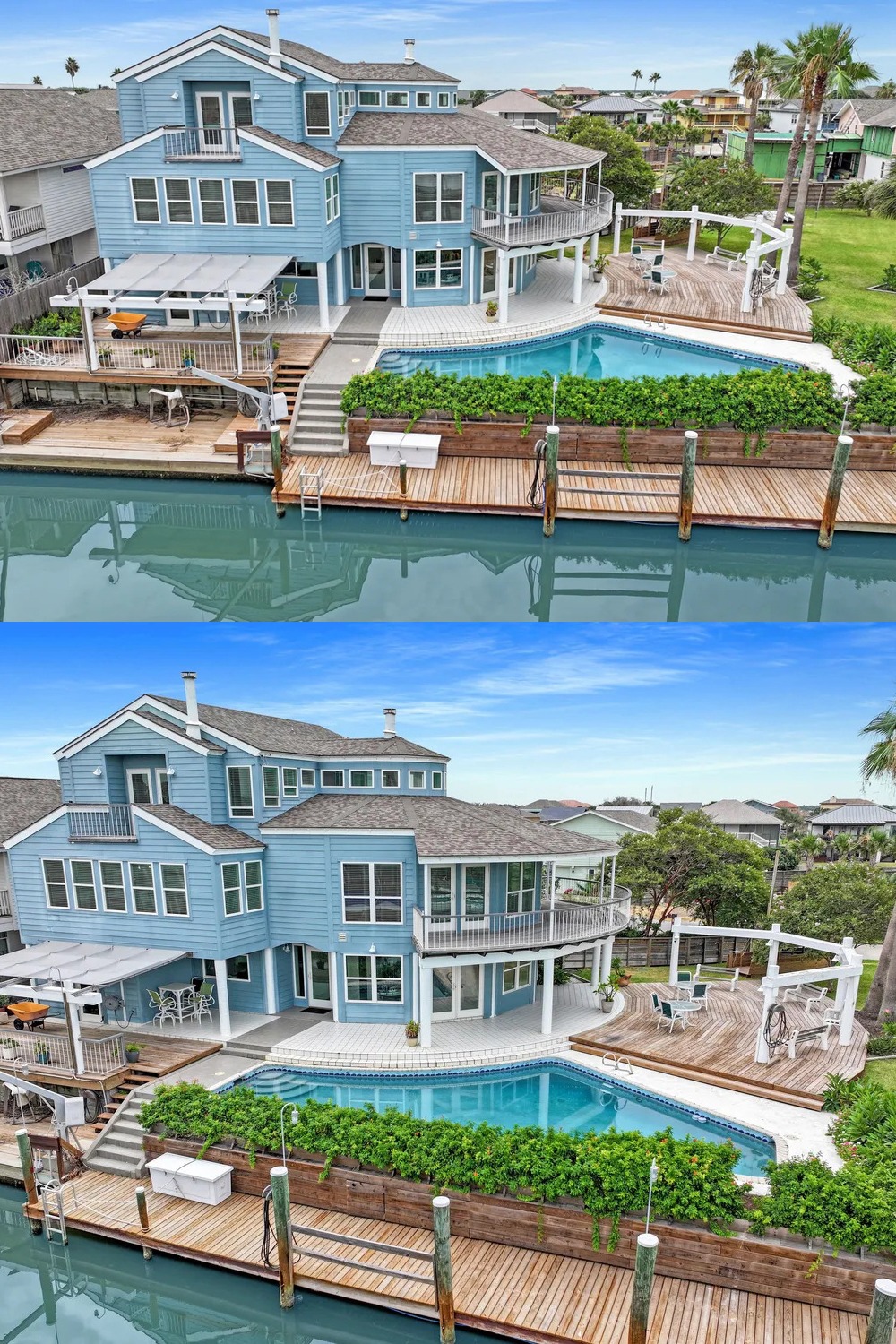 Here, you get the best of both worlds: water on two sides and a sparkling pool. This house wraps around its backyard oasis, with multiple decks and shaded patios for lounging or entertaining. The pale blue siding feels cheerful, and big glass doors connect the indoors to the outdoor living spaces.