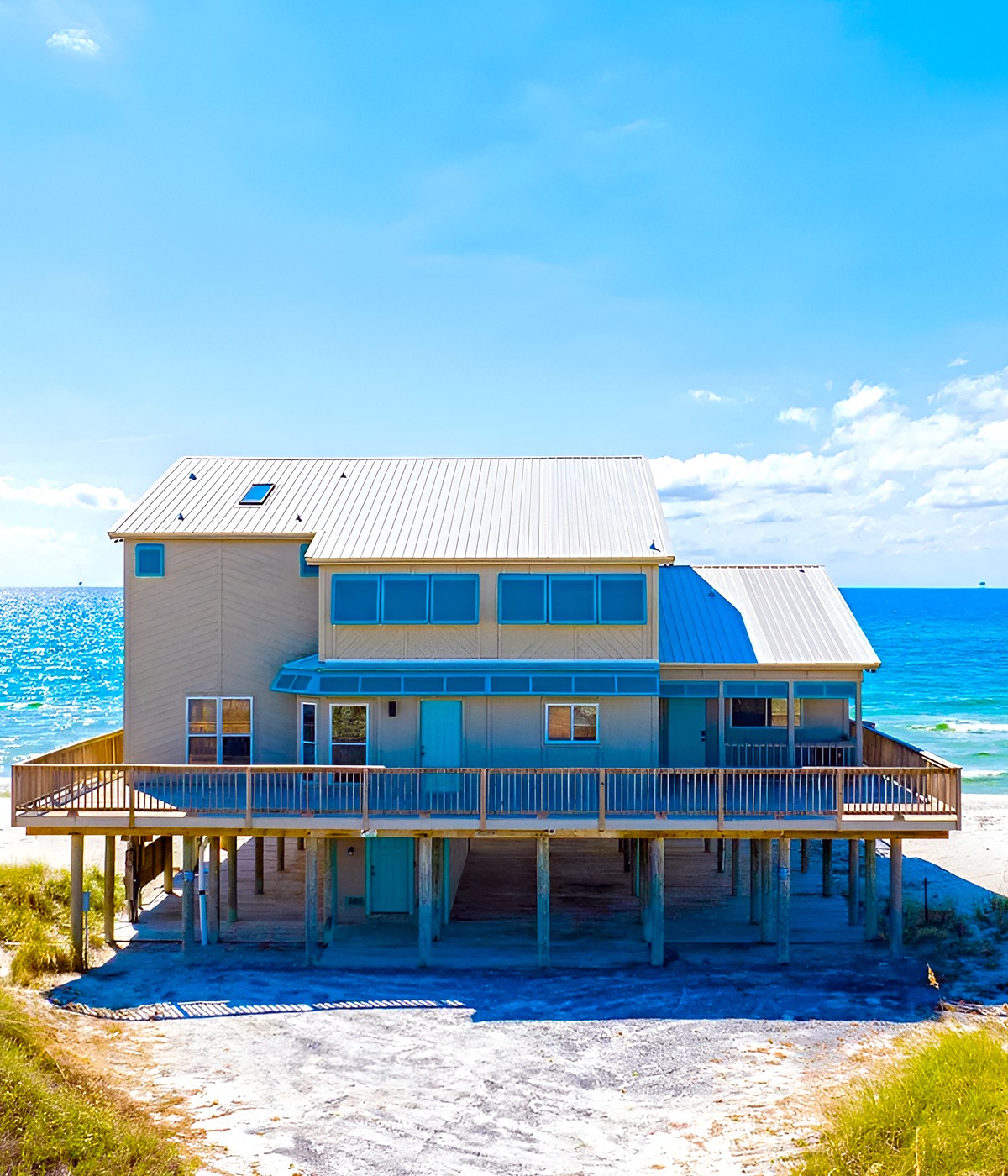 Next is a true beach classic. This stilt house is perched right above the sand, painted in a breezy light blue. Big windows line the walls, and a metal roof keeps things cool. The wraparound deck is ideal for enjoying the ocean view, with space for dining, relaxing, and watching the waves roll in.