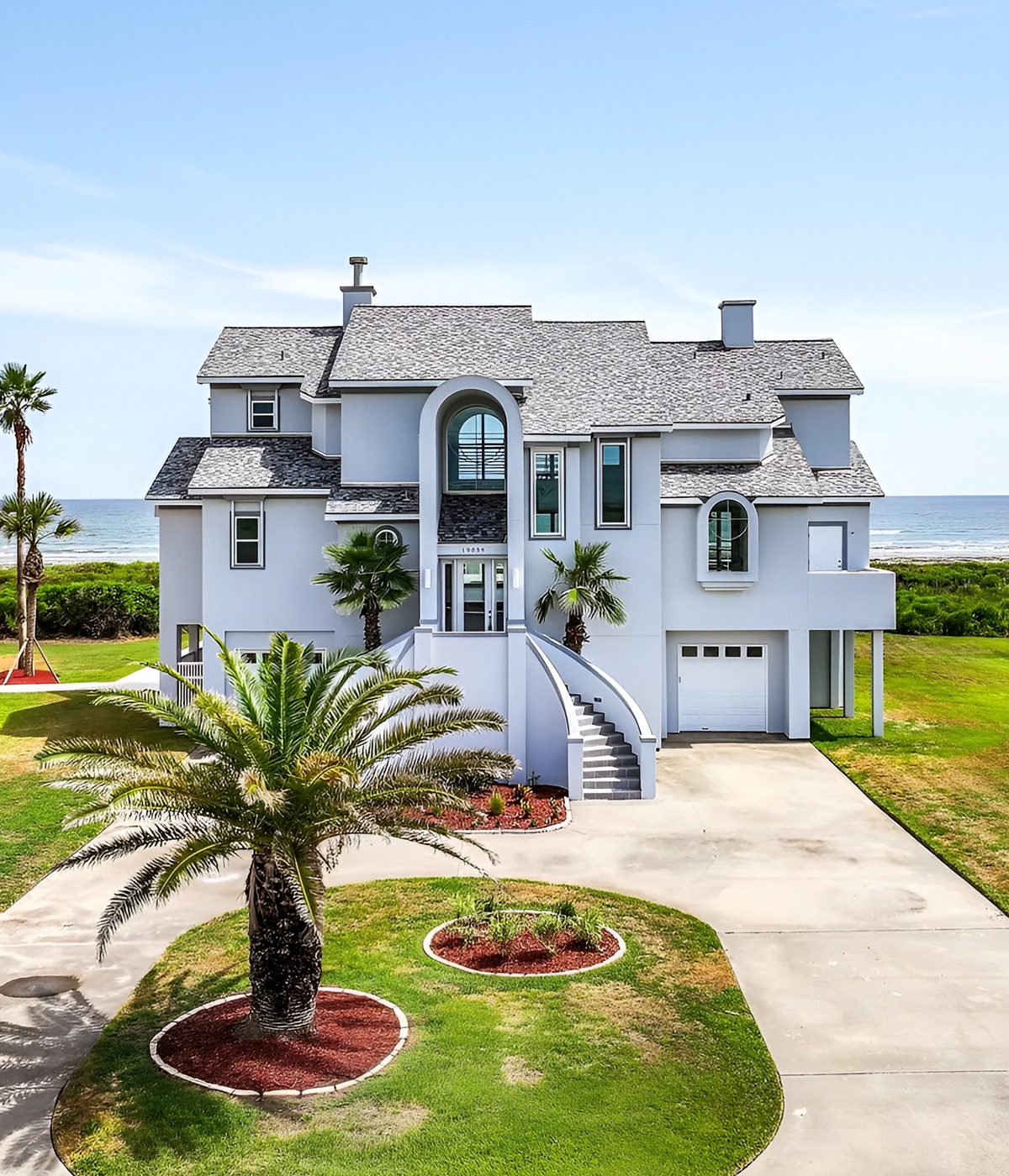 Stepping up in scale, this house feels grand and welcoming. A curved driveway leads to a dramatic staircase and soaring windows. The pale, elegant exterior pairs beautifully with the lush green lawn. Out back, endless ocean views are framed by swaying palms. Every detail feels just a little more special—from the rounded entryway to the rooftop lookout.
