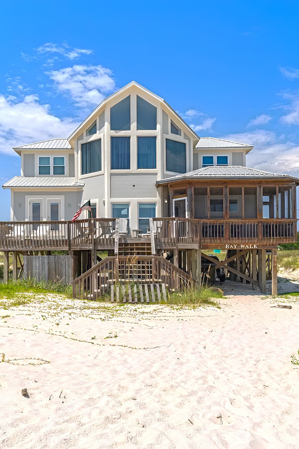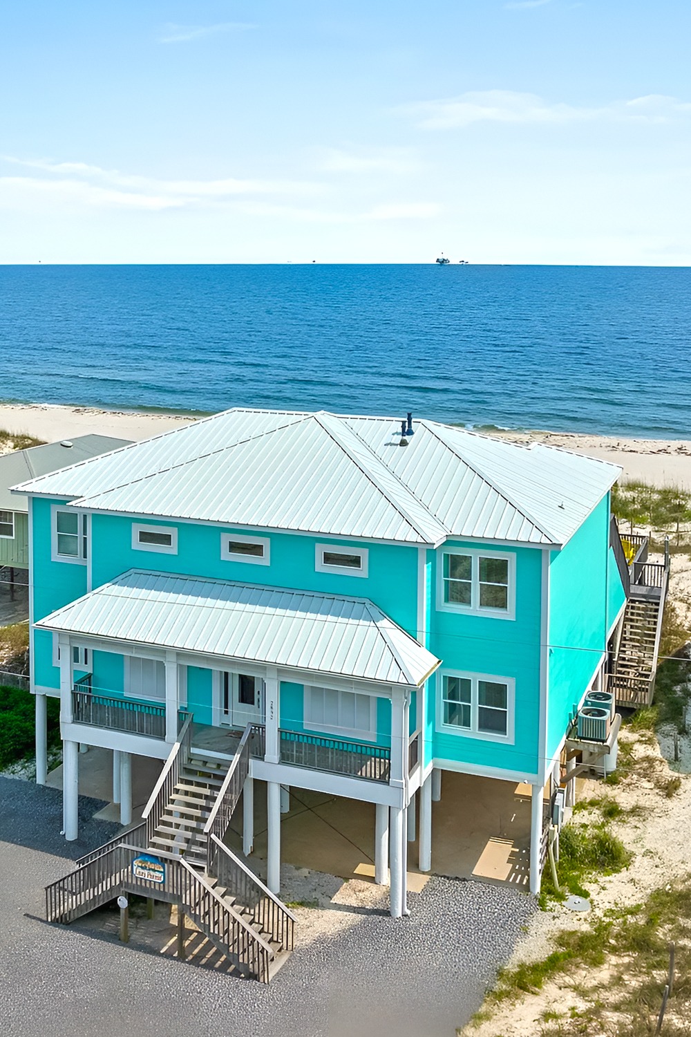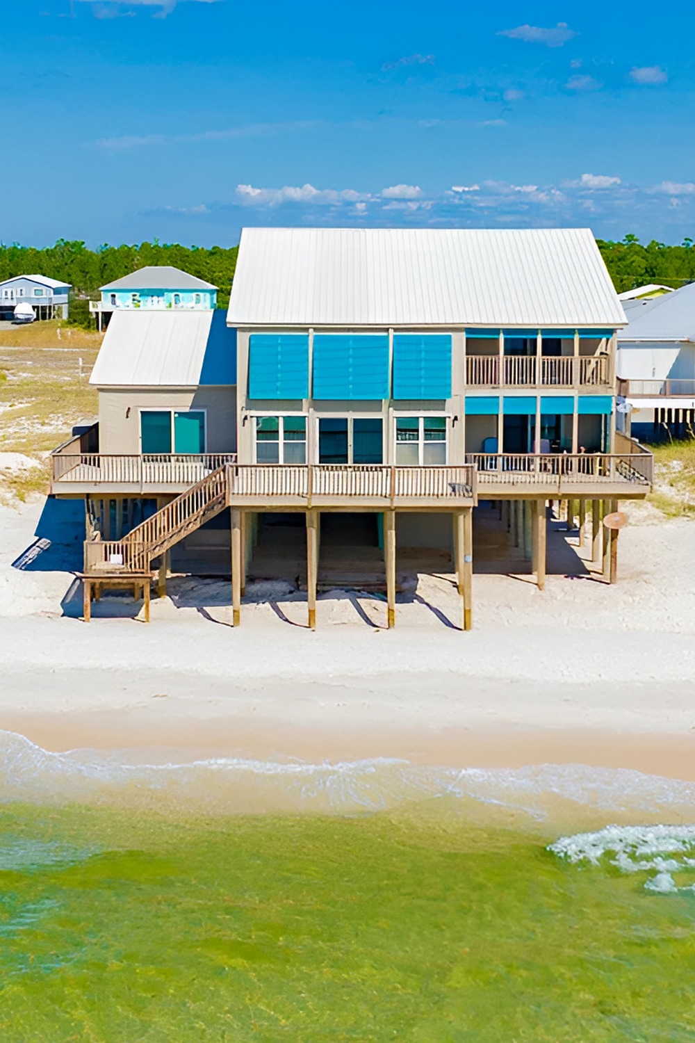 This home feels welcoming and relaxed, perfect for family getaways. The light aqua siding paired with white trim creates a calming vibe. A deep covered porch stretches across the front, inviting you to sit and watch the water. Multiple staircases make beach access easy, while the elevated structure keeps things safe from high tides.