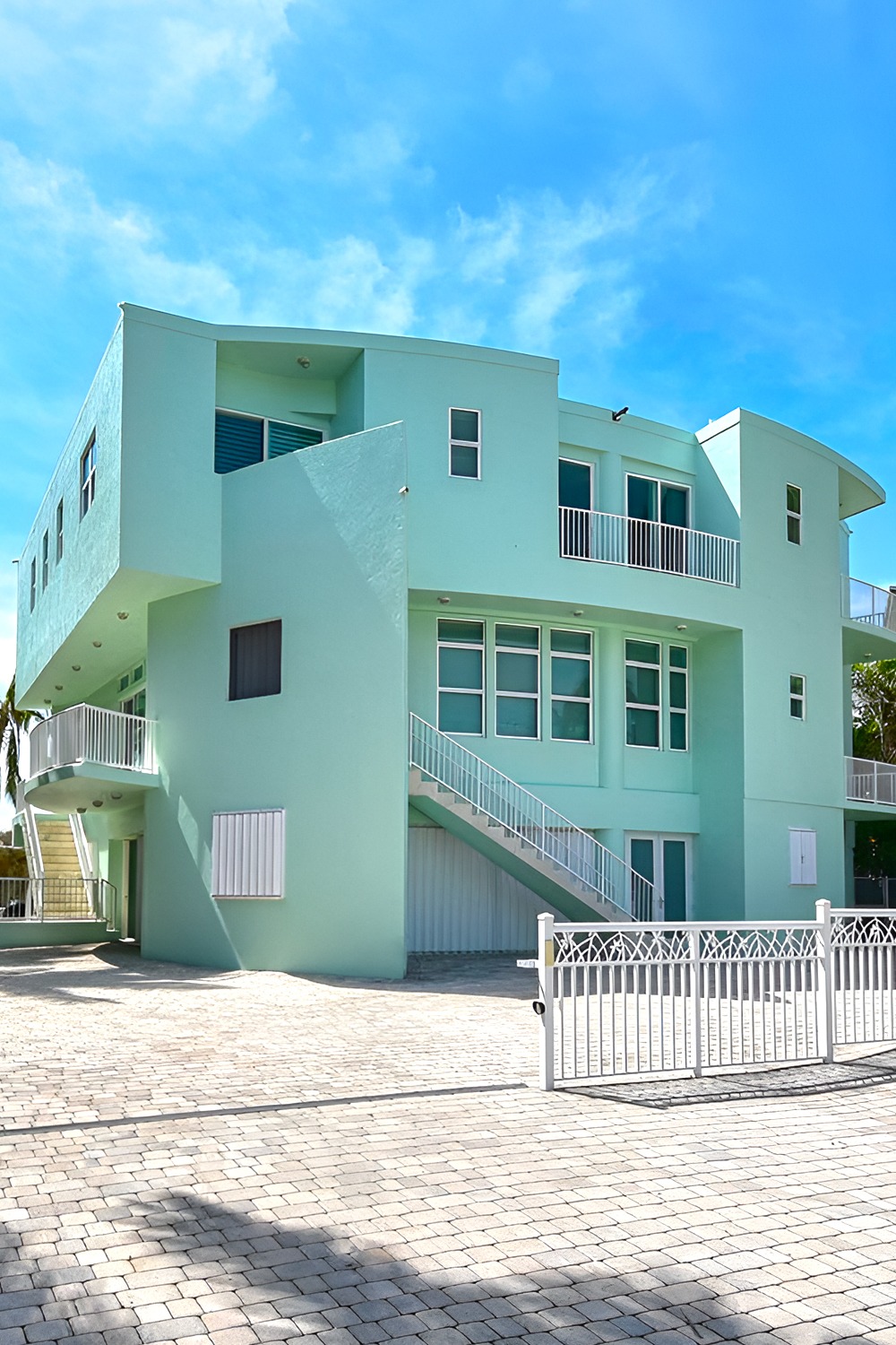 Looking for something modern? This home offers a sleek twist on beach living. Clean lines, soft mint-green stucco, and striking angles give it a fresh look. Multiple balconies and patios ensure you can enjoy the outdoors from any level. The white railings and geometric shapes add a bit of Miami flair.
