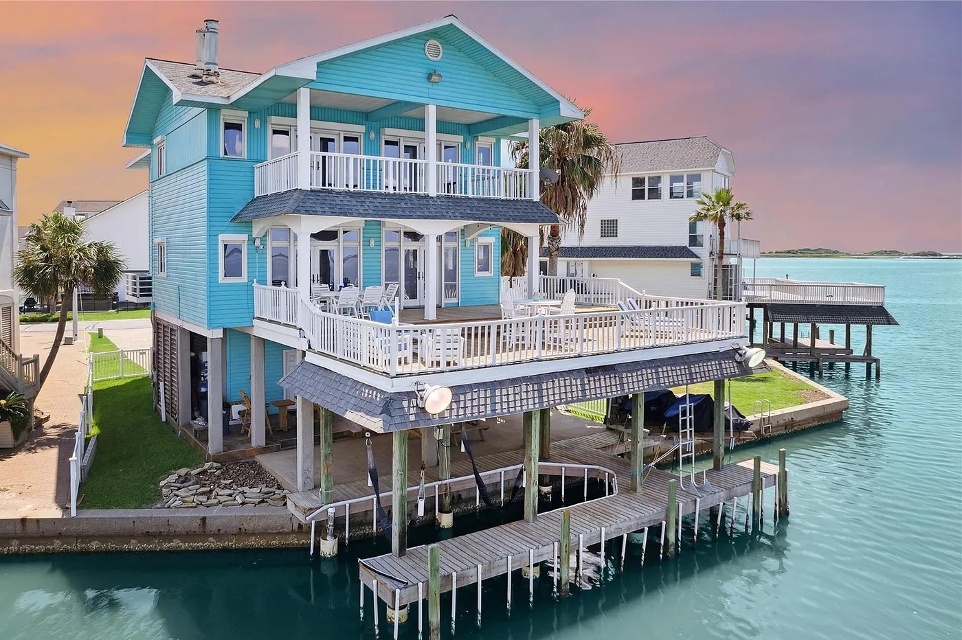 The third house brings the “wow” factor with its bold, two-story design. It sits on sturdy pilings right at the water’s edge. You’ll spot wraparound balconies and decks that offer space for dining, sunbathing, and taking in the views. Soft blue siding and white trim set a relaxed tone, and the big glass doors blur the line between indoors and out.
