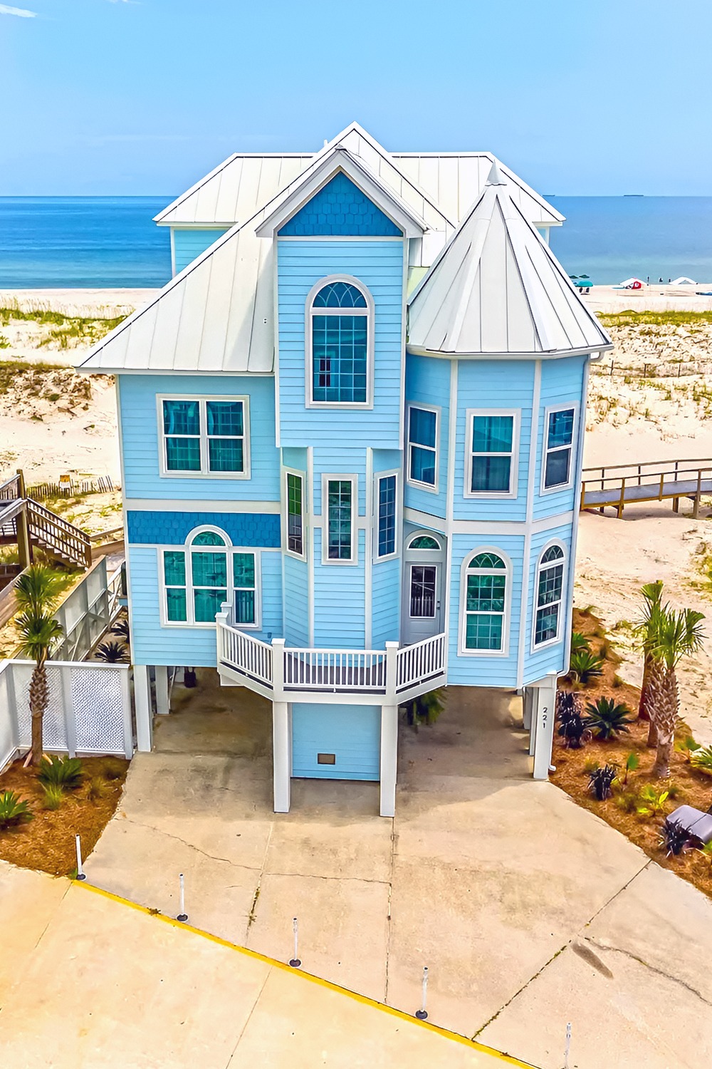 This house stands out with its playful Victorian-inspired look. Light blue siding, decorative trim, and a turret-style bump-out give it lots of character. It’s raised on pilings to keep it safe from the waves. Out back, a private boardwalk leads straight to the sand, so the beach is always just steps away.