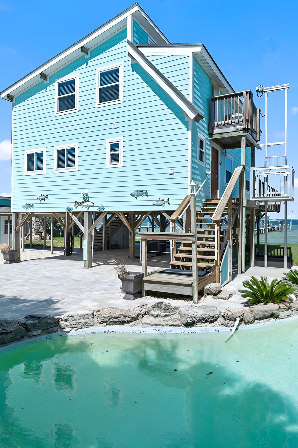 Vivid turquoise siding instantly catches the eye on this elevated home. A double staircase leads up to a generous front porch, flanked by white railings that pop against the bold color. Large windows let in daylight and ocean views, while wide steps make the home feel grand and welcoming.