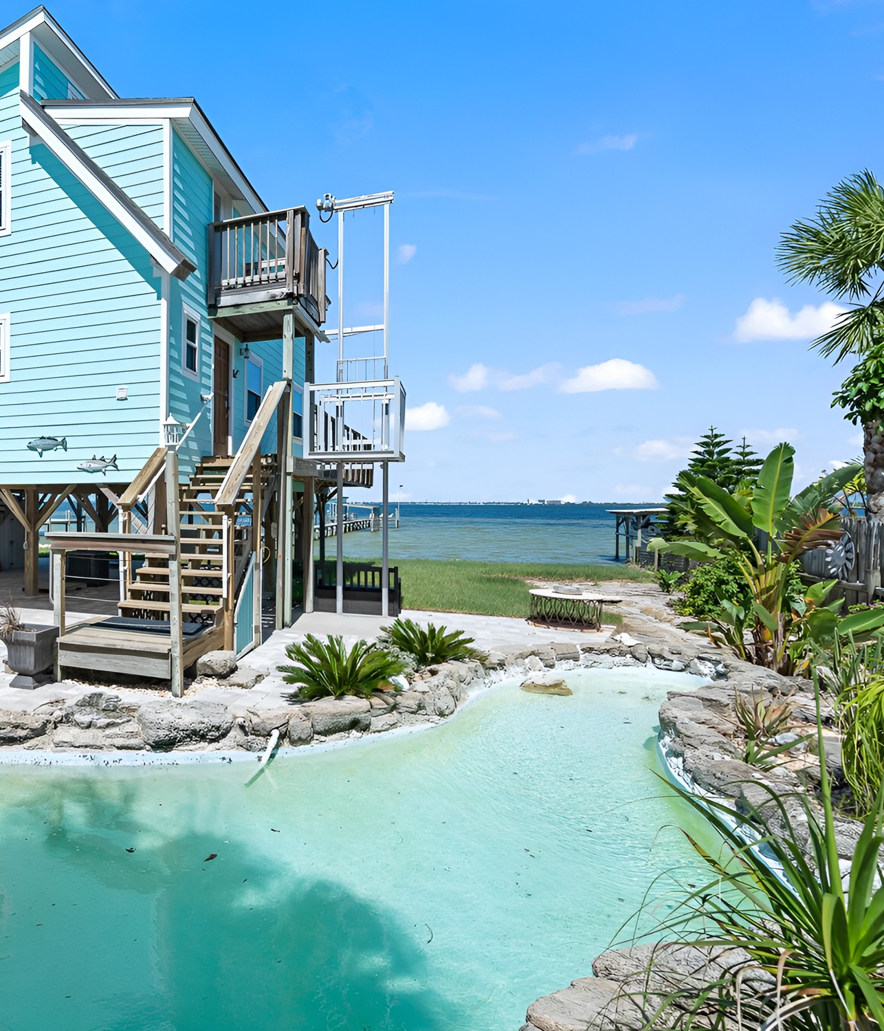 This house is all about laid-back outdoor living. Instead of just a yard, you get a private lagoon-style pool with rock edges and lush landscaping. The soft aqua exterior and crisp white trim keep things beachy. Stairs lead up to covered porches, giving you places to unwind while you watch the waves in the distance.