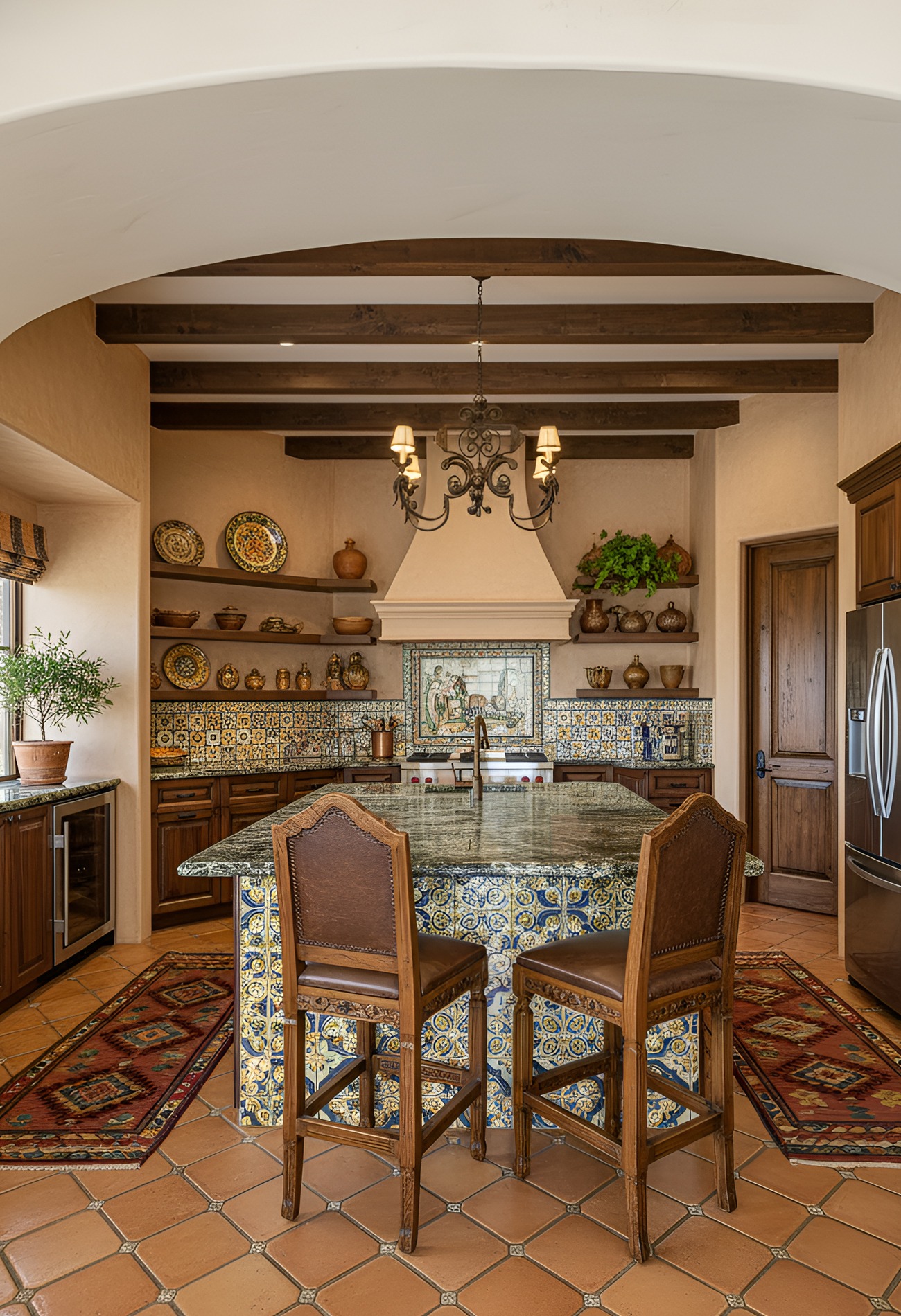 It has warm tile underfoot. It has wood that looks rich and time-worn. It has hand-painted details, soft plaster walls, iron accents, and little touches that feel collected, not staged. This style does not chase trends. It feels rooted. It feels sunny. It feels like a place where fresh tortillas, strong coffee, and long family dinners all belong.