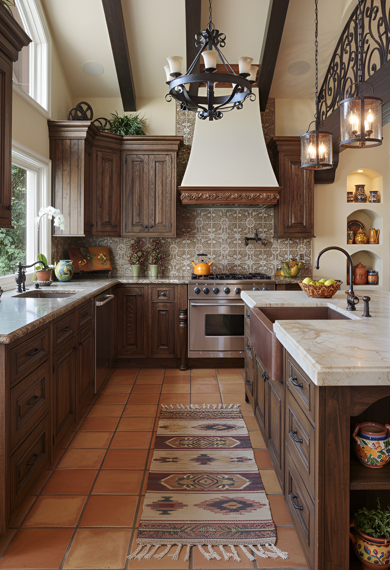 Lantern-style lights are a natural fit. They bring a Spanish feel and look great over an island or dining table. Iron, copper, brass, and aged metal finishes work best.