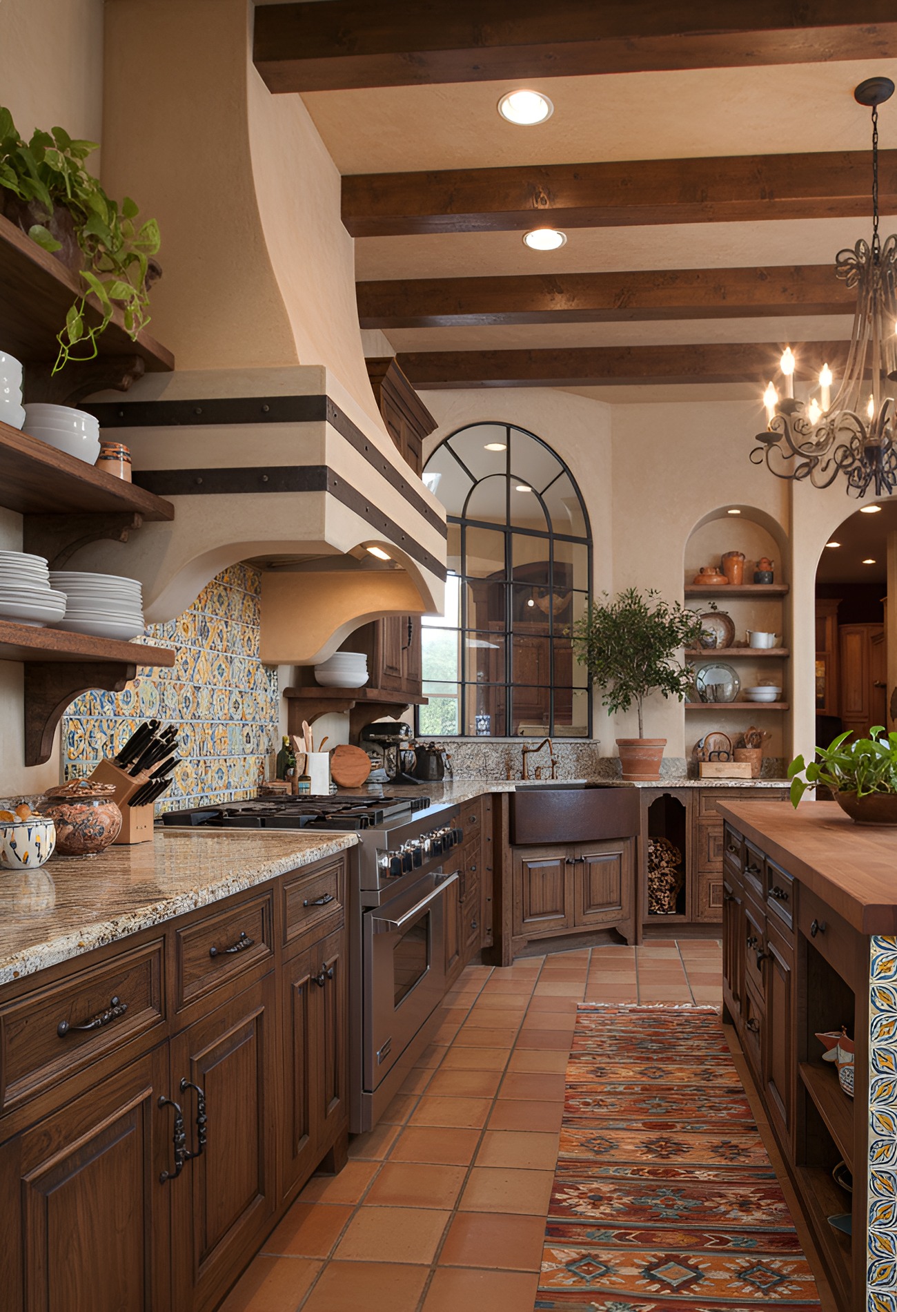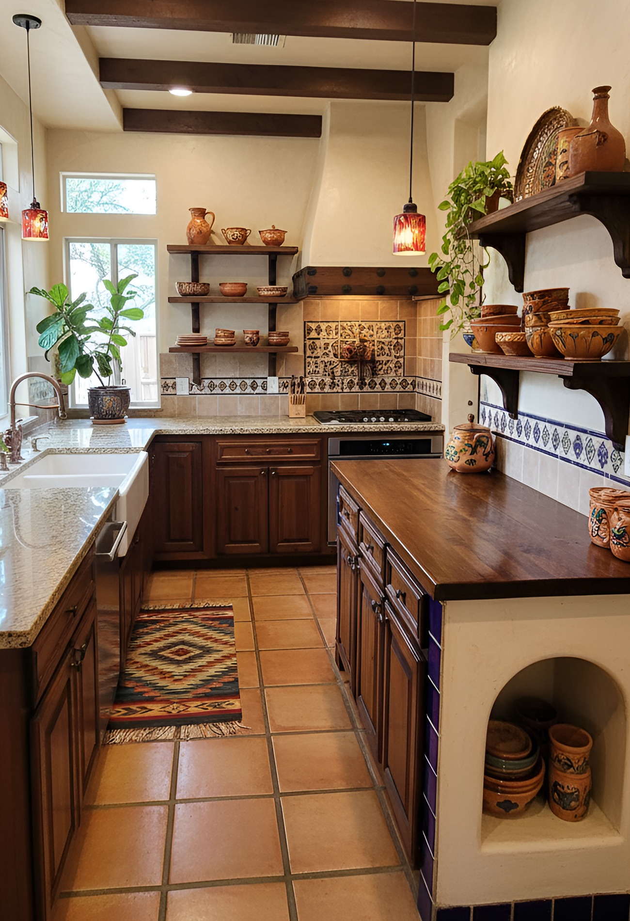 A hacienda kitchen begins with color. The palette should feel sunbaked, natural, and cozy. Think of clay pots, desert sand, aged wood, warm stone, and golden afternoon light.