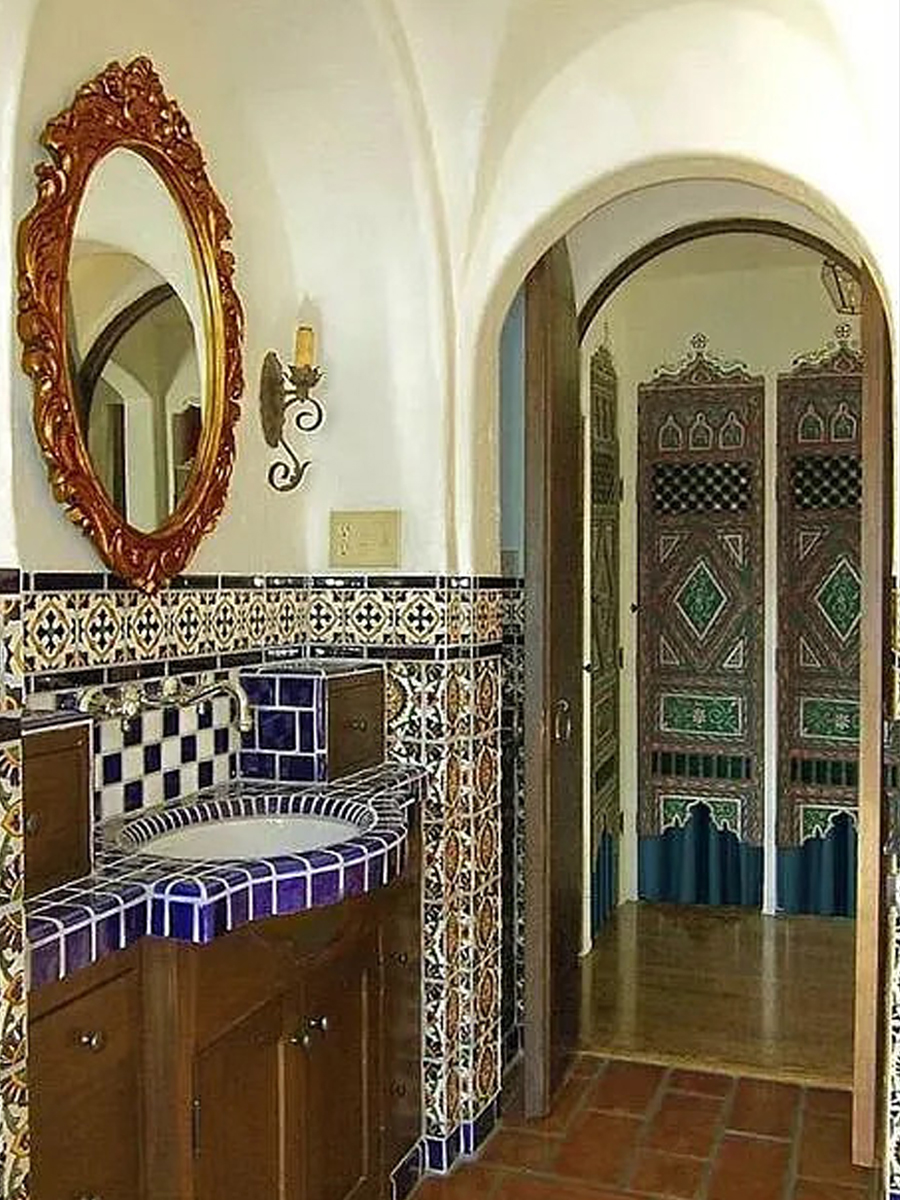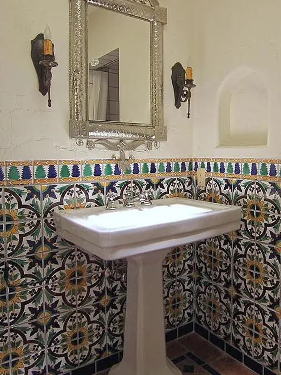 The pedestal sink and tall mirror keep the space open so the walls can shine. This bathroom blends art and architecture with bold Spanish charm.