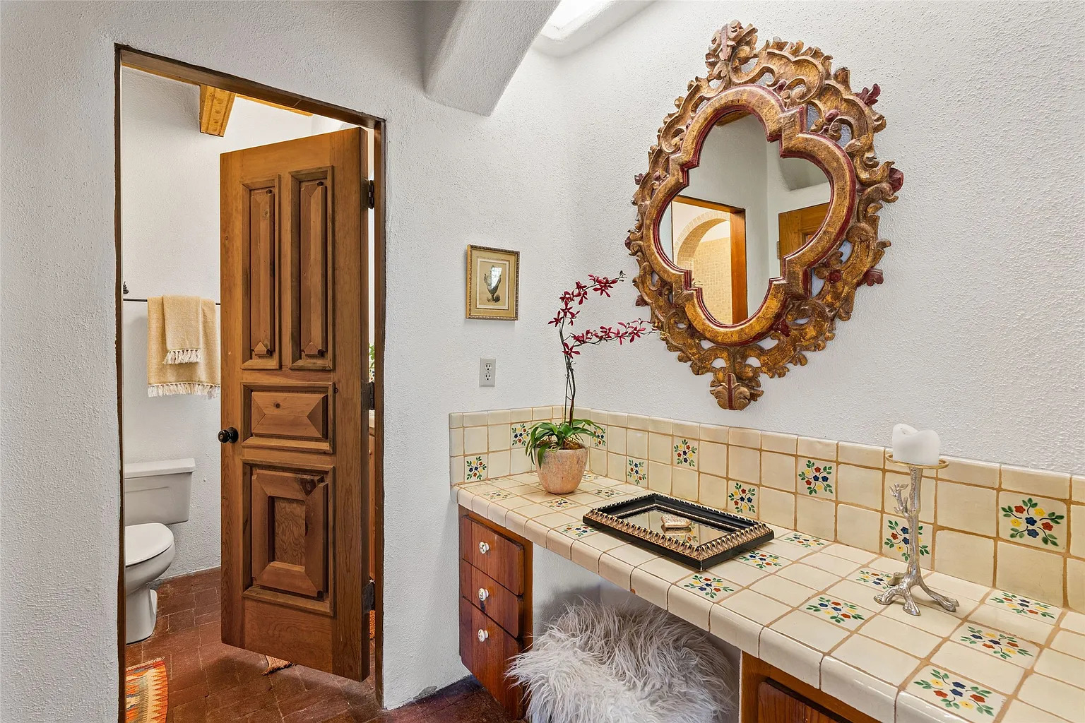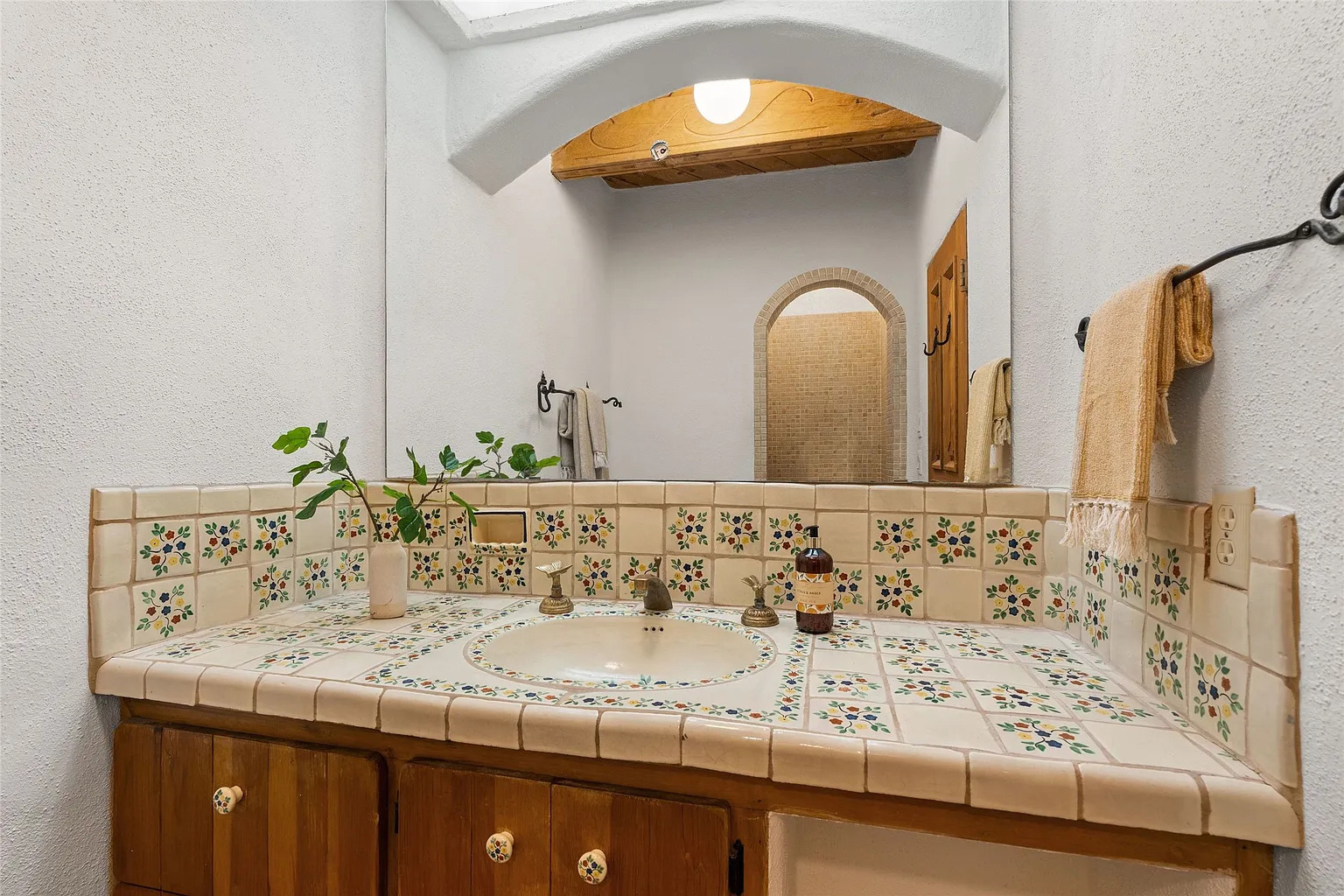 This space feels bright the moment you walk in. The warm white walls help the patterned tile countertop stand out. Each tile has tiny painted flowers, which brings a sweet, handmade look. The old-world mirror adds more drama. Its carved frame makes the room feel like a cozy nook in a historic hacienda.