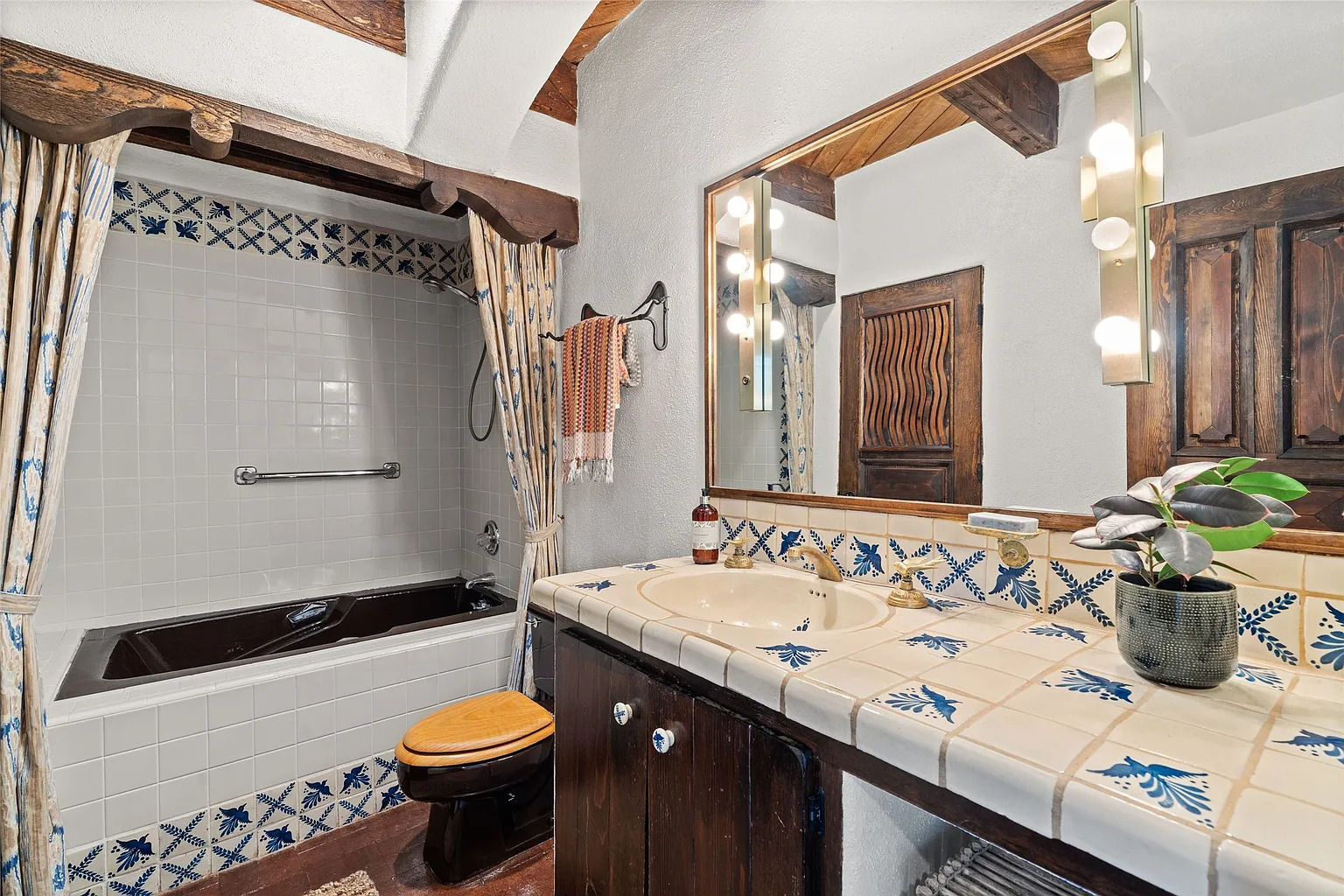If you love rich textures, hand-painted tile, rustic beams, and rooms that feel calm yet full of character, you’re in the right place. Let’s step inside—because these bathrooms are too beautiful to miss.