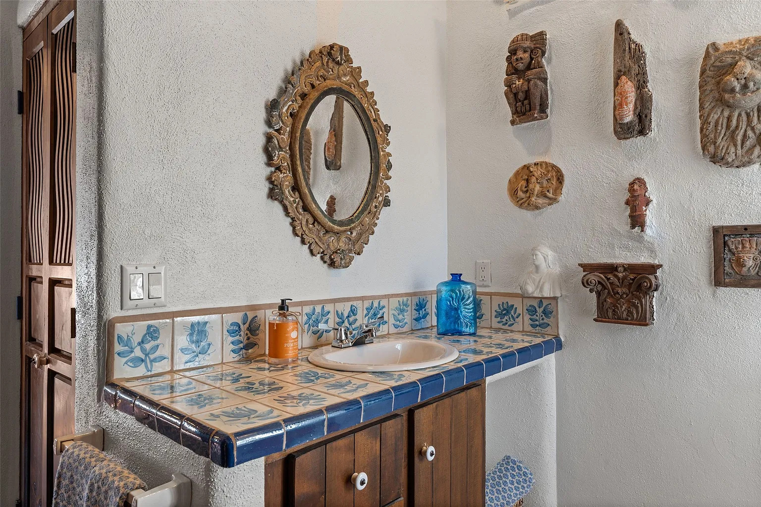 The carved mirror brings in rich gold tones. It adds warmth and depth. The textured walls look like old adobe, which ties the whole look together. The rustic wooden cabinets and doors add that sturdy hacienda charm.