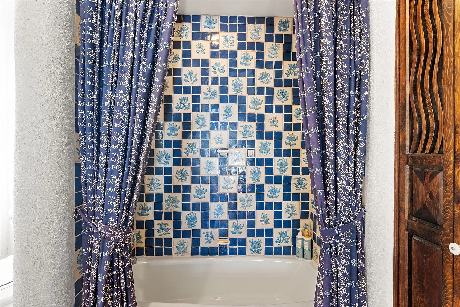 The patterned curtains frame the tub like a little stage. Their soft print matches the tile theme, which helps the space feel pulled together. The curved wood door beside the tub brings a warm, rustic note. It feels sturdy and full of character.