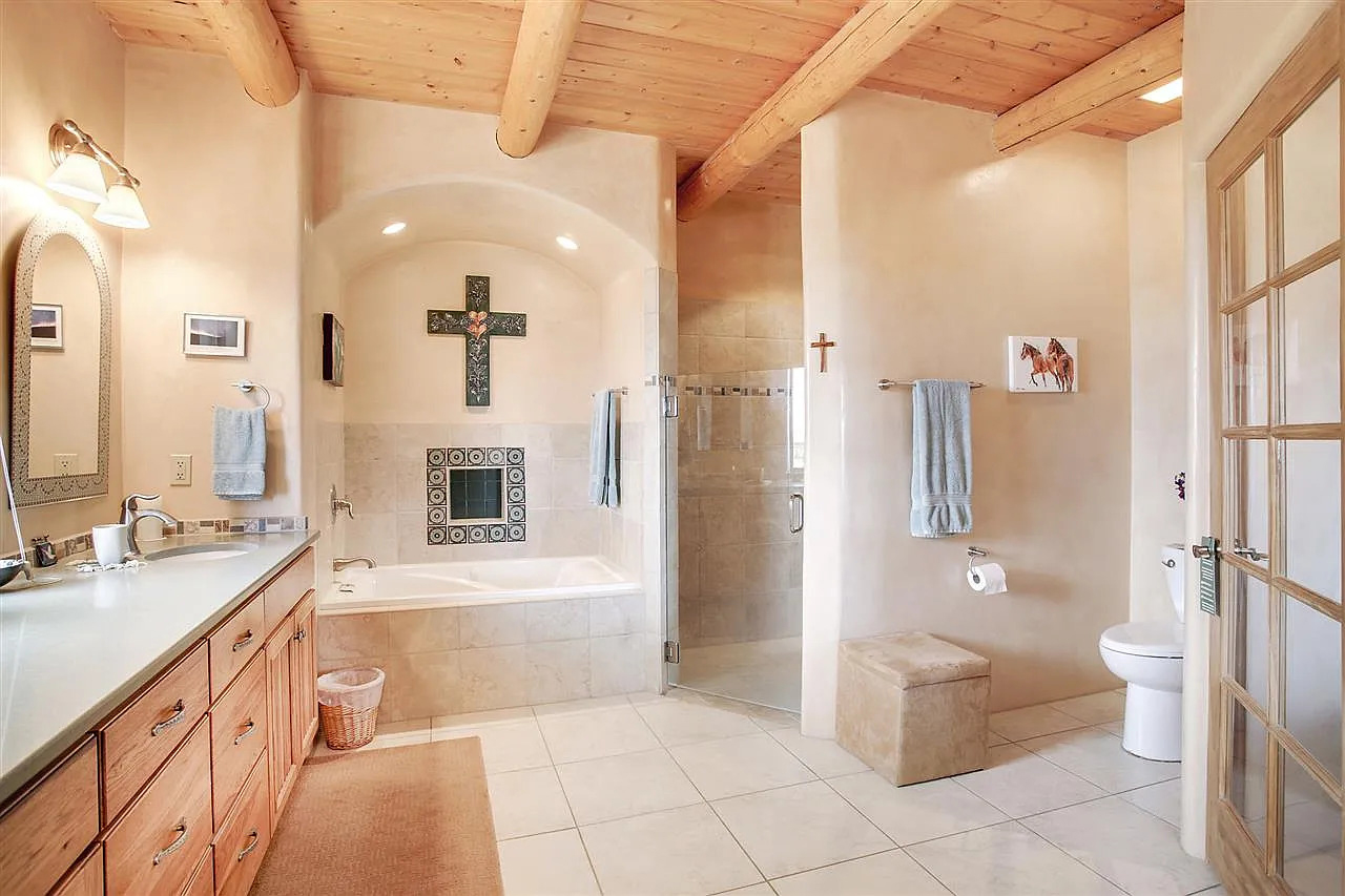 The shower stays simple with white tiles and a patterned top border. The wood beam ceiling gives the room an earthy, authentic hacienda feel. The large mirror reflects light and makes the space feel calm and open.