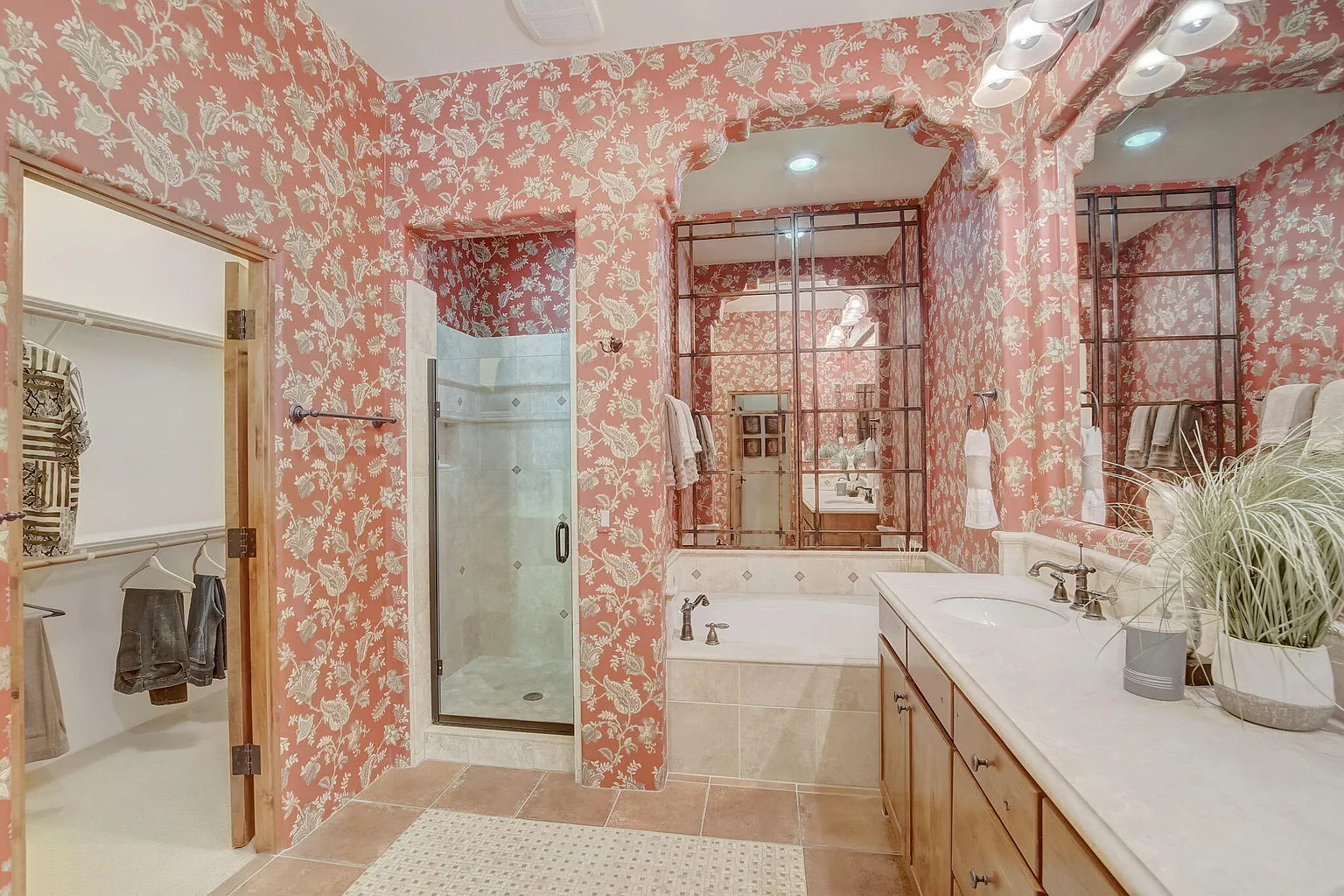 Look twice and you’ll spot something charming hidden behind the bold wallpaper. The room feels lively from the moment you step inside. The red floral prints brighten the space and give it a soft, romantic glow. Yet the arched cutouts and deep wood tones still tie it back to classic Spanish style.