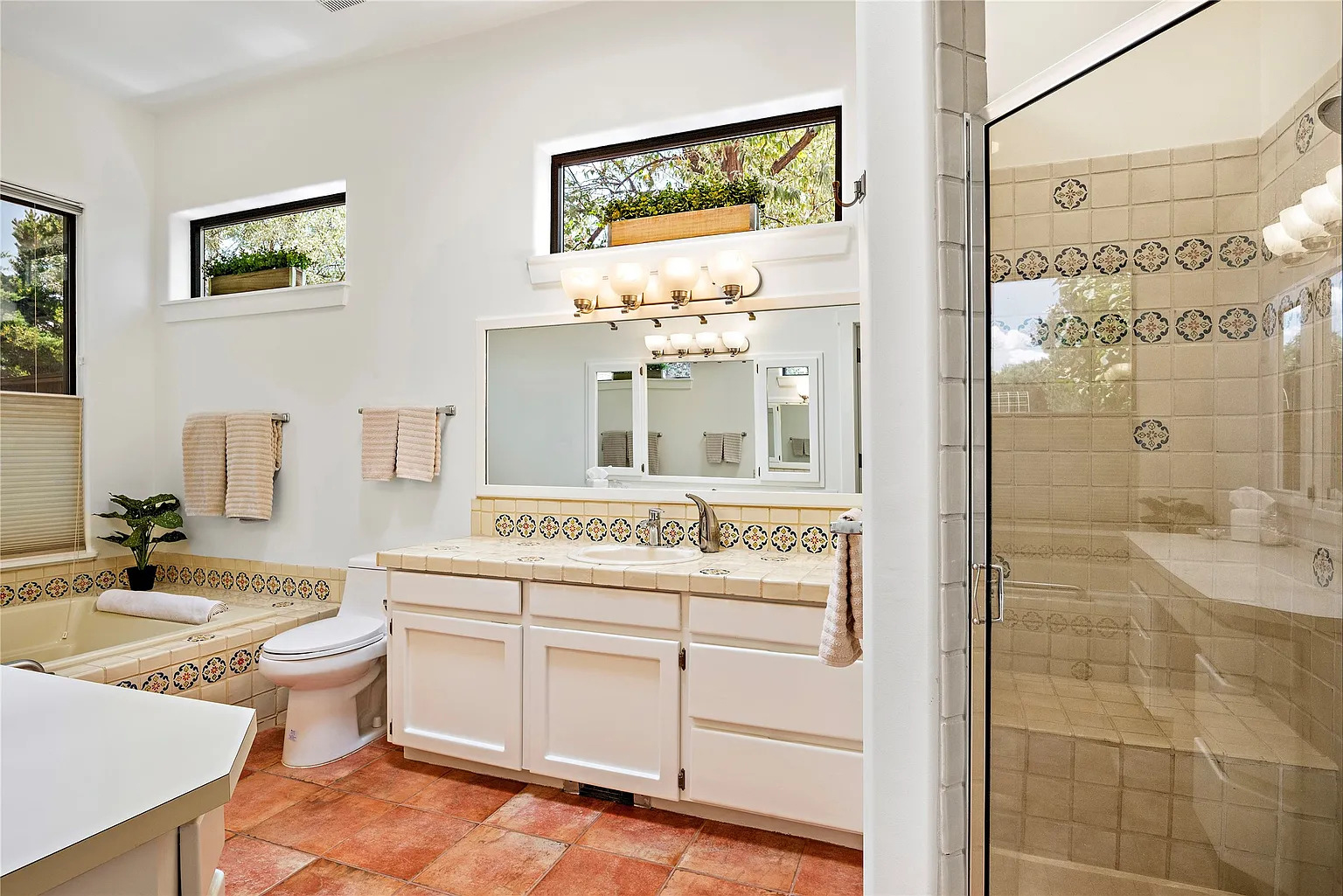 This bathroom feels warm the second you walk in. The terracotta floor brings rich color and earthy texture. It sets the tone for the room. The cream tile around the tub and vanity keeps the look soft and classic.