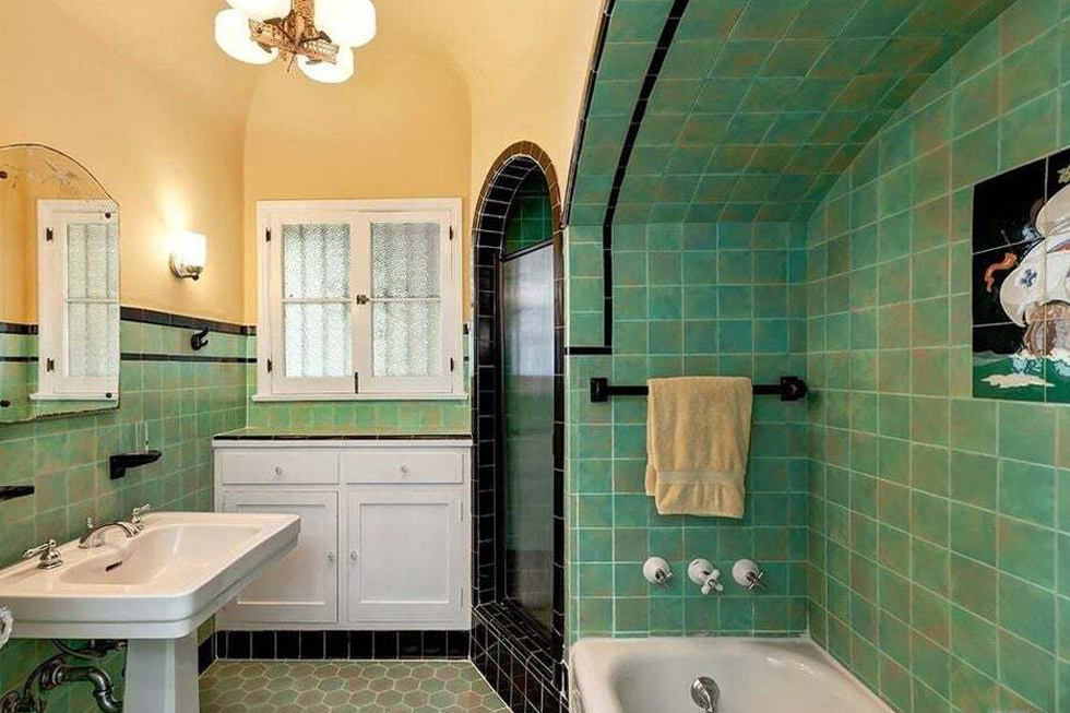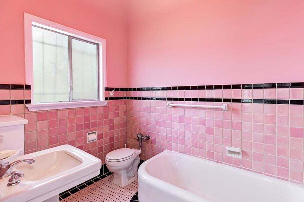 You can’t help but smile when you see this room. The soft pink tile feels sweet and cheerful. It brings a fun twist to vintage Spanish style. The glossy black trim adds a sharp contrast. It keeps the room from feeling too soft.