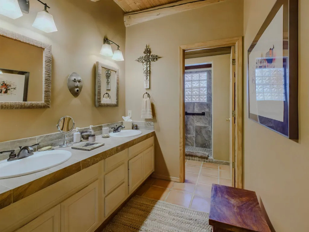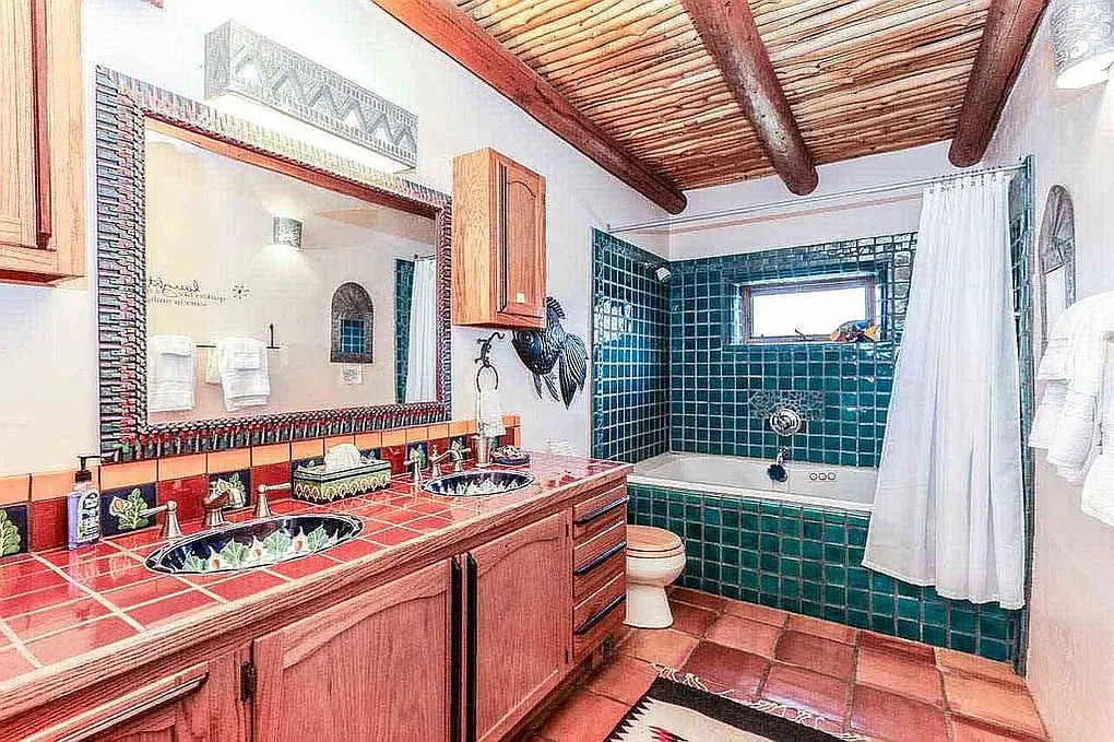 The ceiling stands out too. Thin wooden vigas run across the top. They bring warmth and texture to the room. The red tile countertop adds a handcrafted feel. And the sinks are painted with floral designs that echo traditional Talavera pottery.