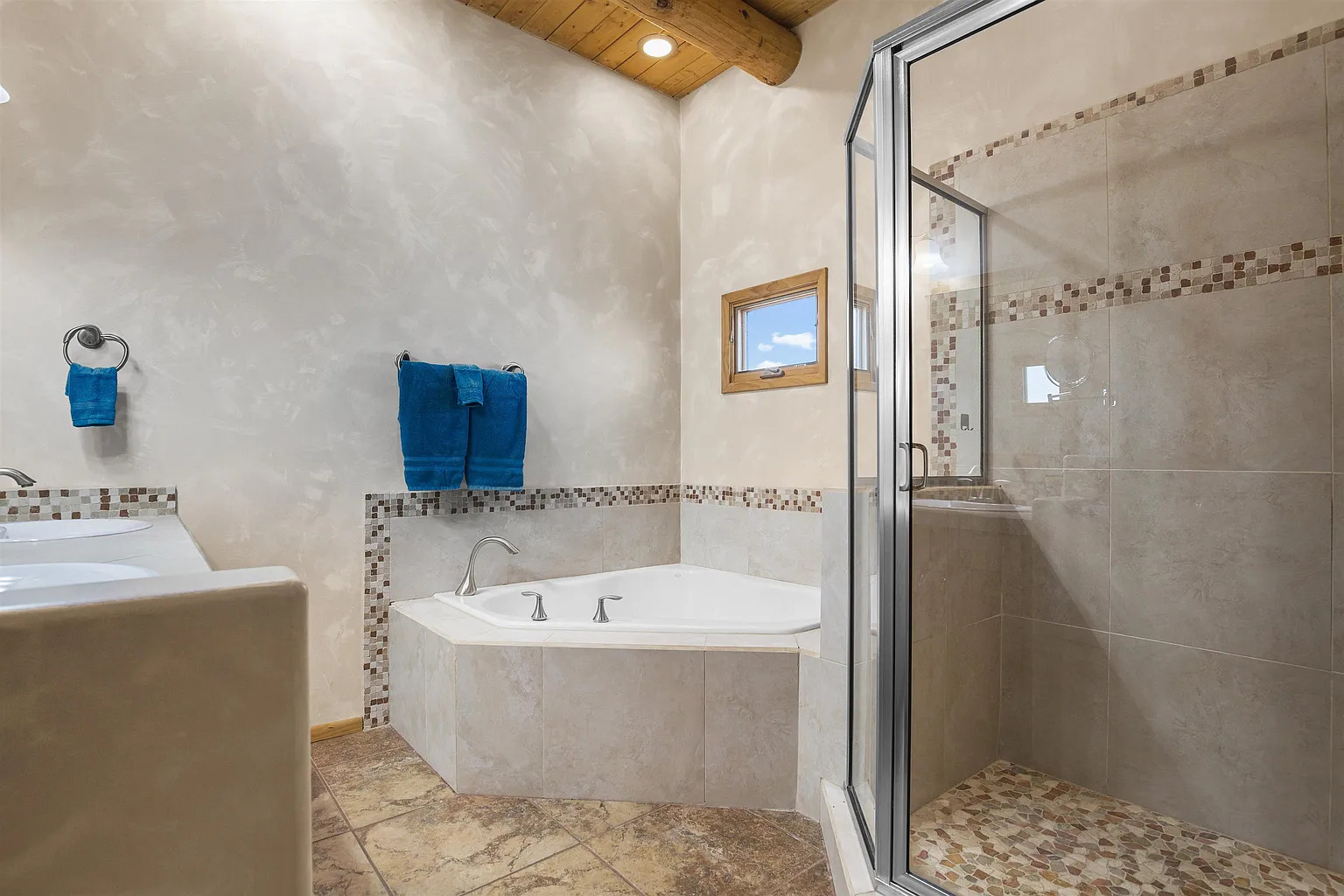 This bathroom feels peaceful the moment you see it. The plaster walls have a soft, brushed look that reflects the light gently. The corner tub gives the room a spa feel. The little mosaic border adds color and pattern without feeling busy.
