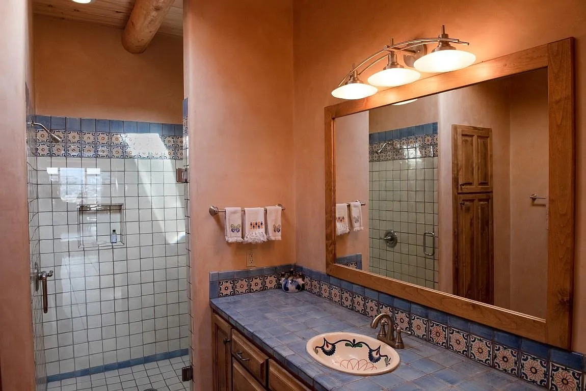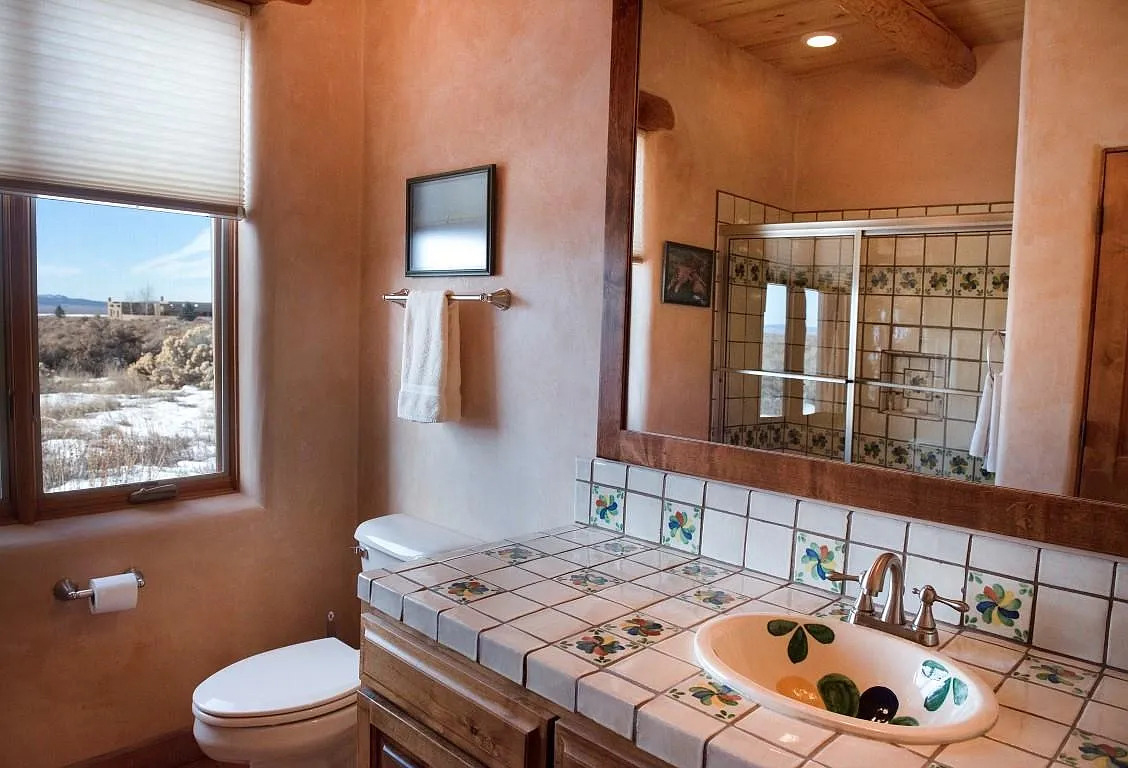 21. Tile Art and Mountain Views in a Cozy Adobe Bath